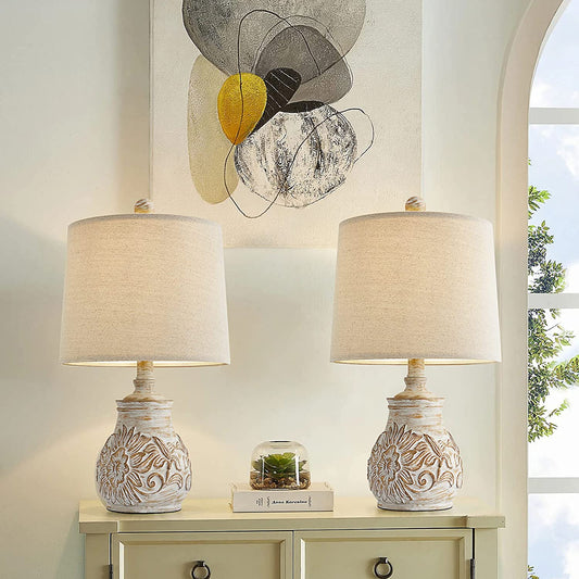18.5'' Farmhouse Vintage Table Lamps for Living Room Traditional Carved Floral Bedside Lamps Washed White-No Touch