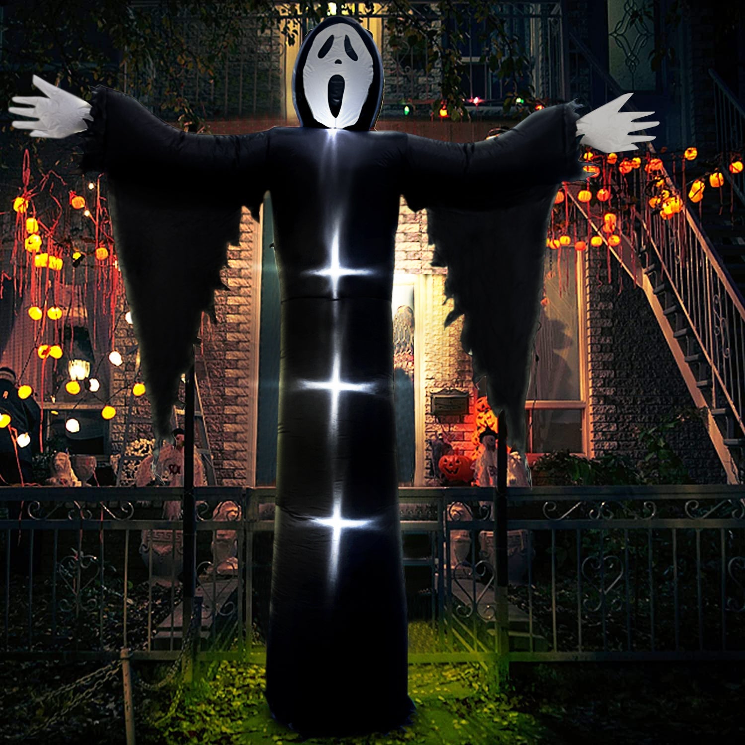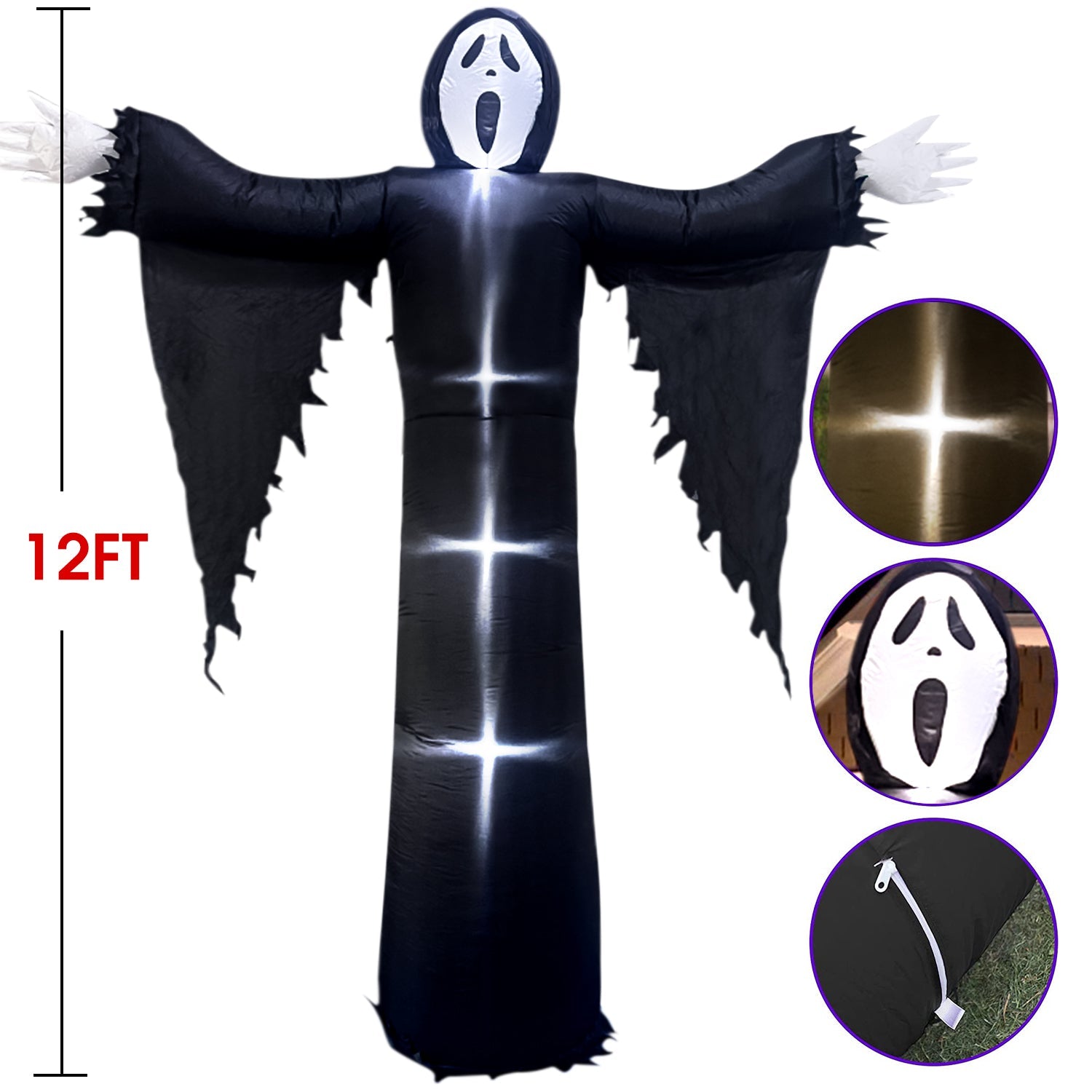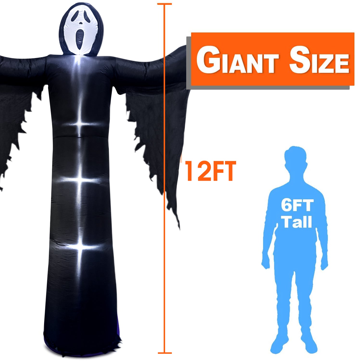 Our 12ft large inflatable grim reaper with built in LED lights inside, this blow up adds an eye catching centerpiece for Halloween Holiday. The grim reaper emits a glow, emits a terrifying color, creating a terrifying atmosphere.