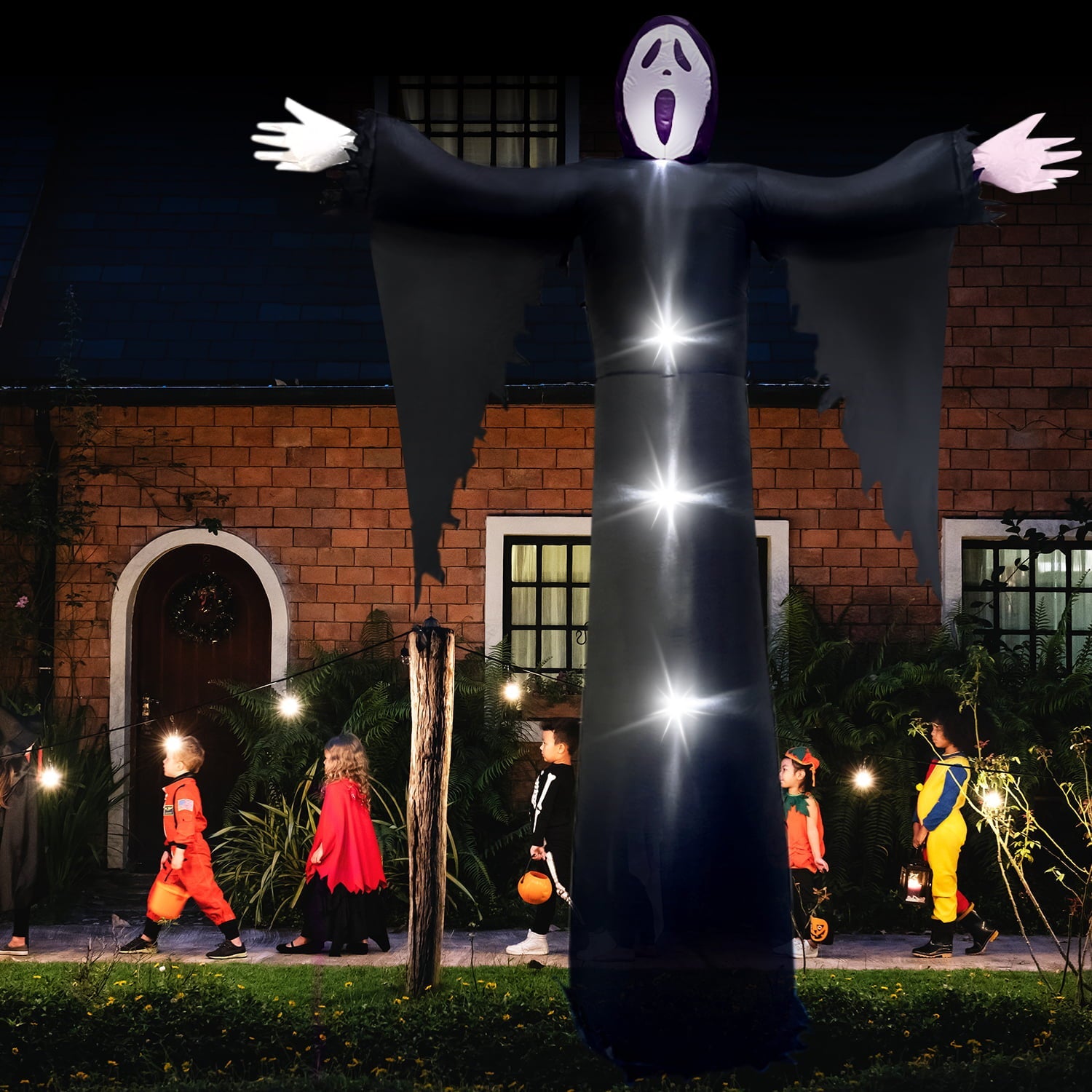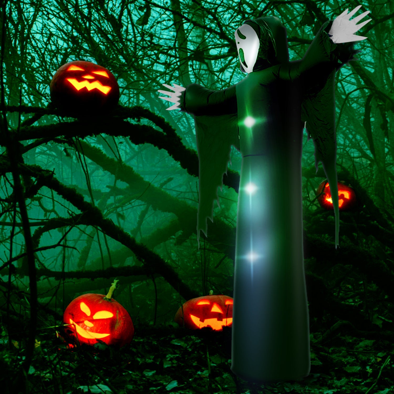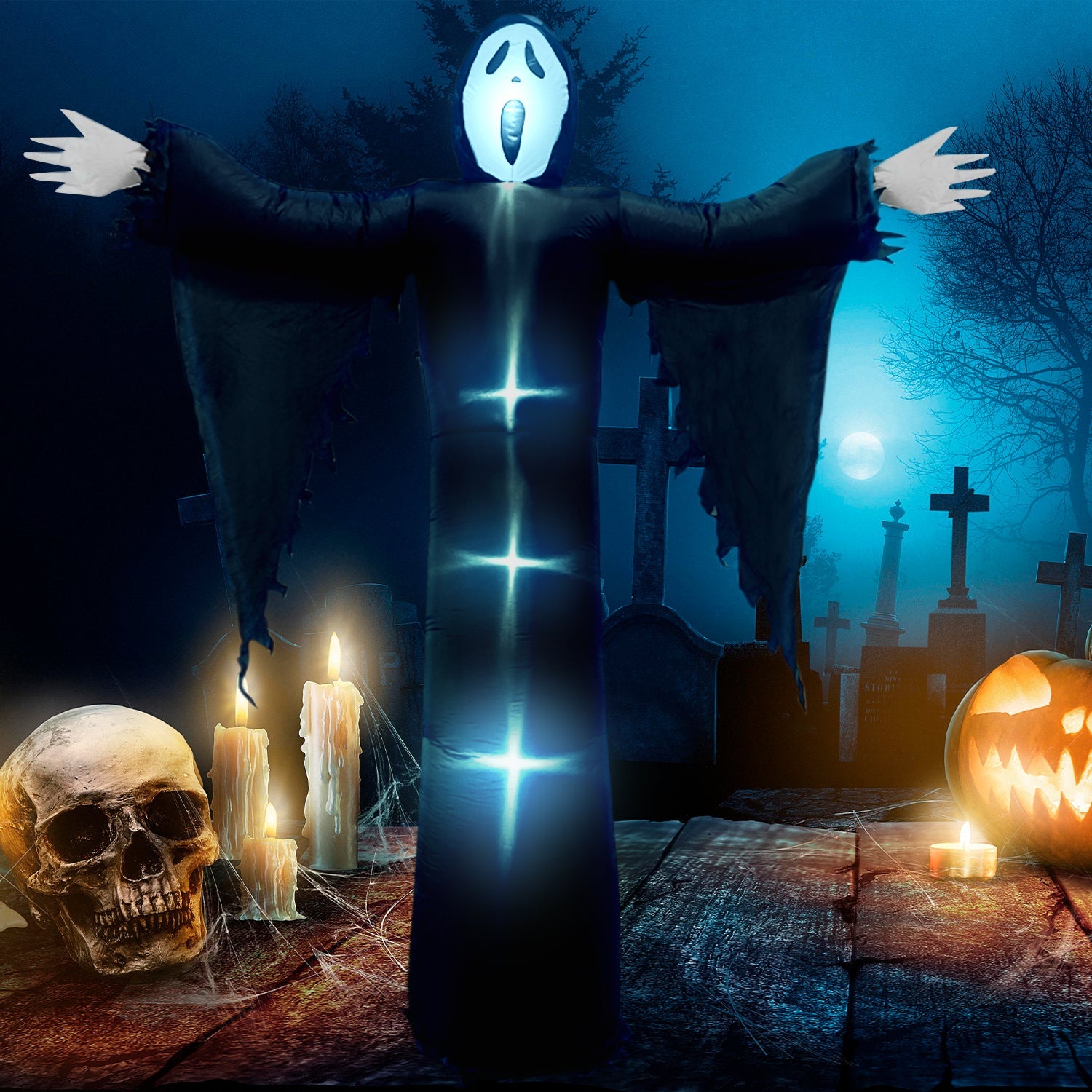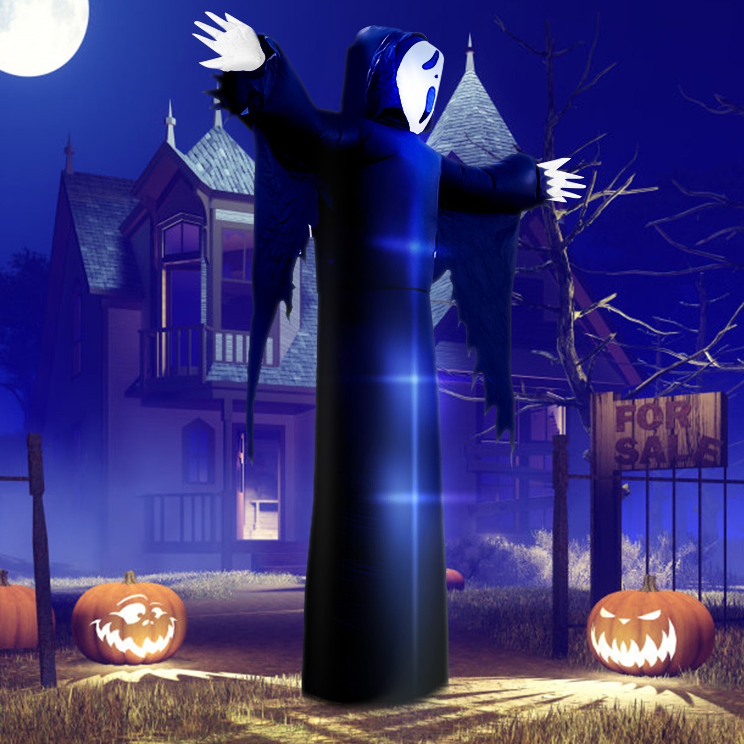 Our 12ft large inflatable grim reaper with built in LED lights inside, this blow up adds an eye catching centerpiece for Halloween Holiday. The grim reaper emits a glow, emits a terrifying color, creating a terrifying atmosphere.