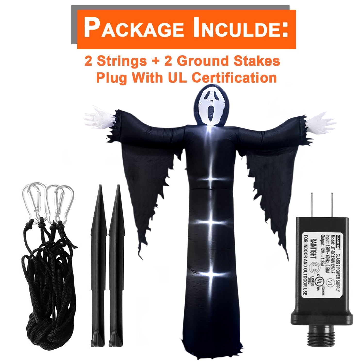 2 stakes and 2 tie downs are provided. Built-in fixed sandbag, a zippered opening at the bottom provides space to add some heavy items to make it more safe and stable. No need to worry about your Halloween yard inflatables blowing away in the wind.