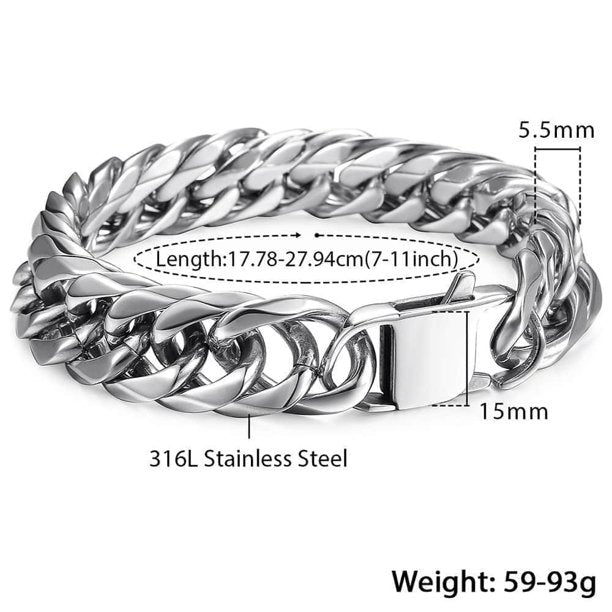 15mm Wide 10 inch Curb Cuban Rombo Mens 316L Stainless Steel Chain Bracelet Silver