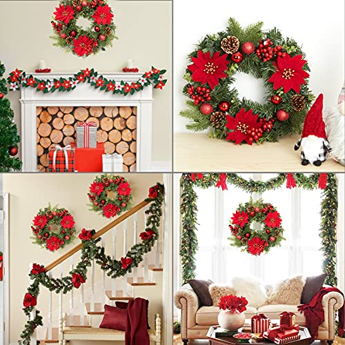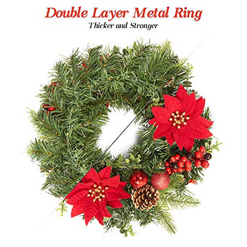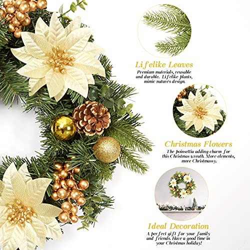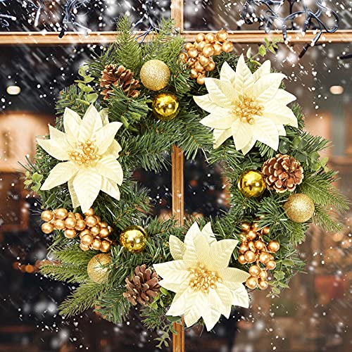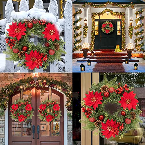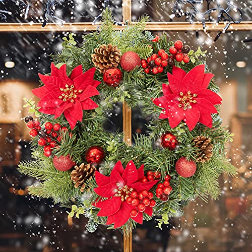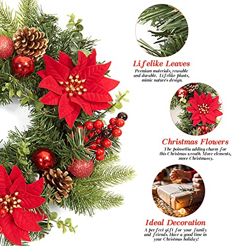 - [Combination of Rich Christmas Elements]: Our Christmas door wreath features combination of realistic pine branches, gold poinsettia flowers, pine cones, gold berries and christmas ball ornaments. Rich details and charming design will bring a dense festive atmosphere.