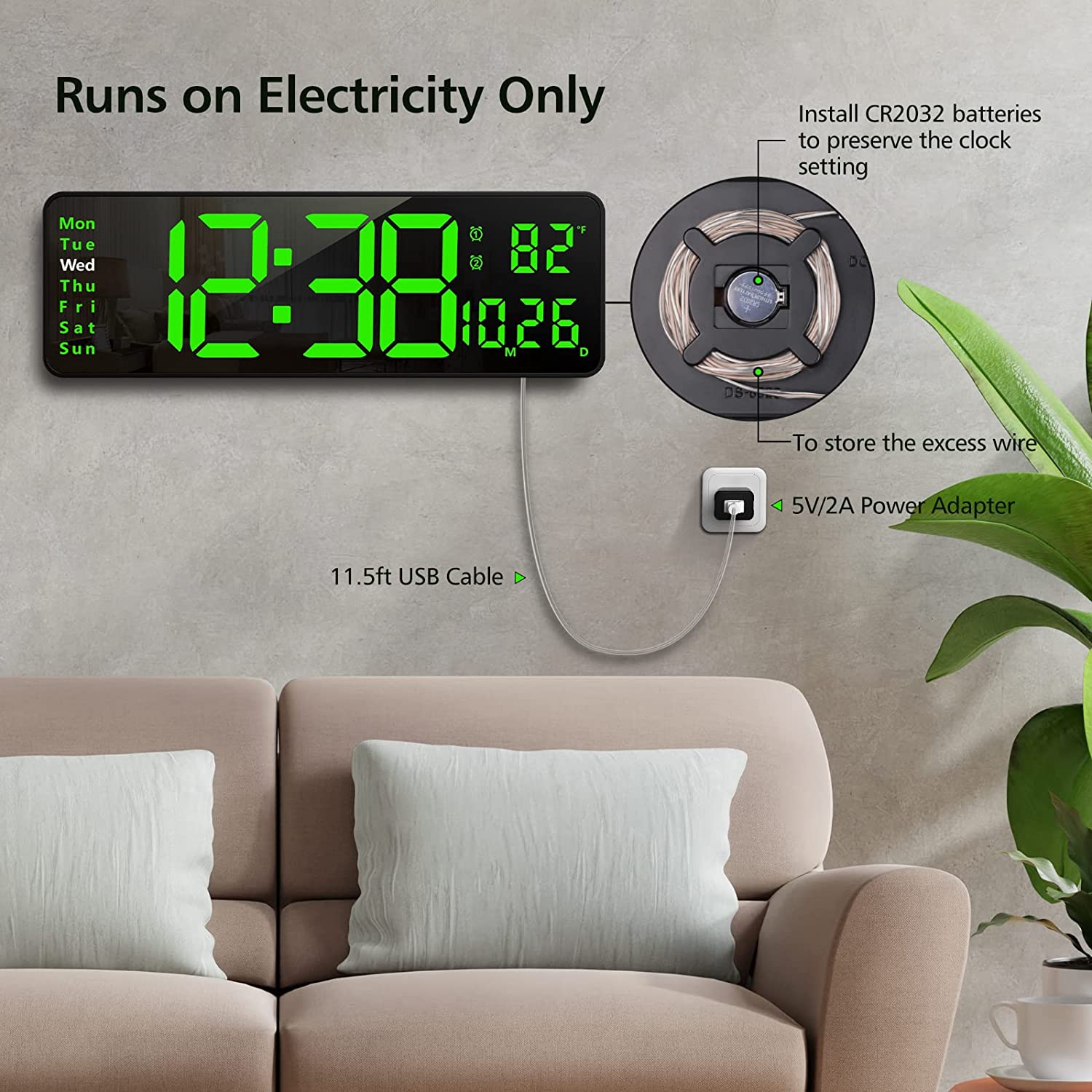 - Convenient in Every Detail - Come with a universal DC 5V/2A Power Adapter, which saves more space than the "wall wart" style adapter and can even be used for mobile device. Come with an 11.5ft Long Power Cord, it is convenient for the clock to be wall-mounted in any required position. Hidden Coiled Cord Design, no need to worry about the power cord being too long.
