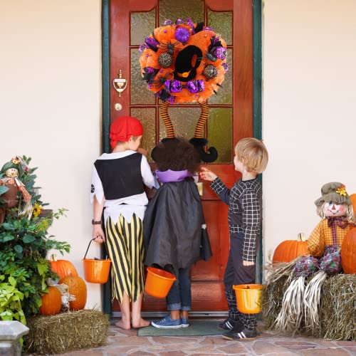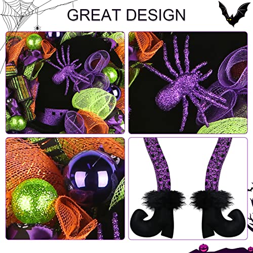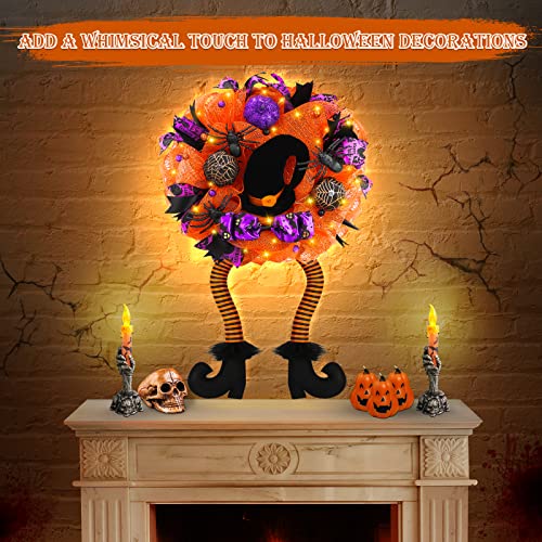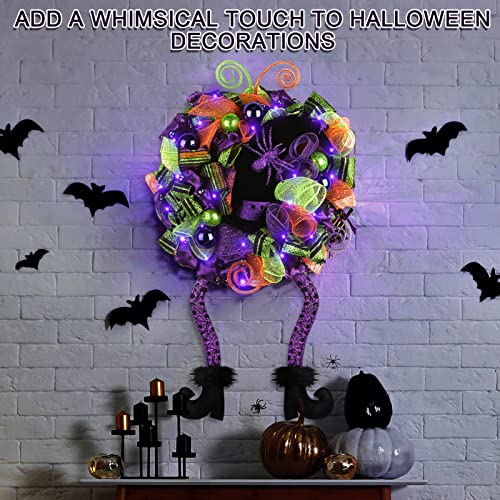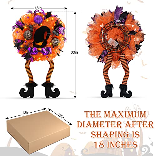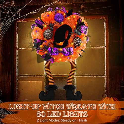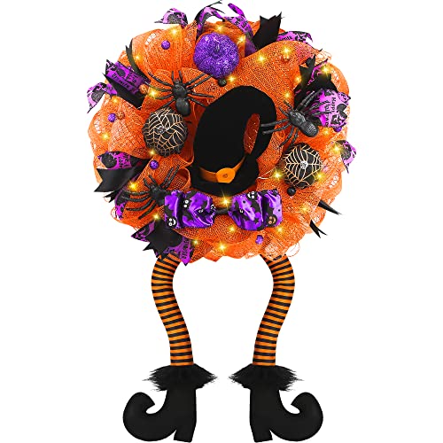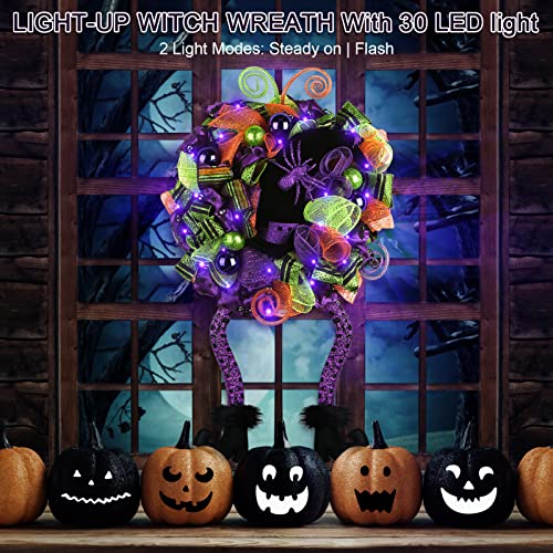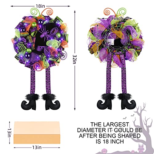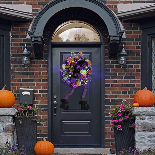 - Unique Design - Fun witch wreath perfect for families with children. The Halloween wreaths are decorated with orange, green, and purple colored deco mesh and 3 different variations of Halloween ribbon, decoration with purple green balls, bow and 3 colors of mesh tubes. Middle with a large black witch's hat, prelit 30 LED lights, fun witches wreath with dangly legs.