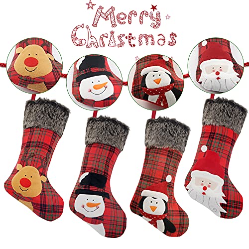 - 🎁Original Design🎁 This value package comes with 4 big Xmas cute stockings with Cute Penguin, Santa, Snowman and Reindeer. Put carefully selected gifts for the family and children. They will look definitely great when hanging to Christmas tree, bedside, stairs, the fireplace. Perfect decoration for Christmas, New Year at home, restaurant, club, bar.