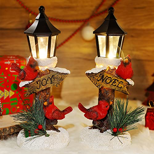 - 2 Pack Christmas Tabletop Lampposts: Christmas set of 2 light up red cardinal table decoration with warm white LED in the lantern brings holiday touch to your space. Design adding an elegant, festive atmosphere to your home decor centerpieces year after year. Measurement: 4 in W x 3.7 in L x 10.2 in H.