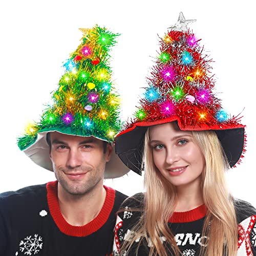 - [ 2 Pack Tinsel Sparkle Christmas Tree Hats ] Pack of 2 unisex Christmas Tree Hats with red and green dual colors. Each measures 18*15.7 inch(height*width), one size fit most adults and kids.