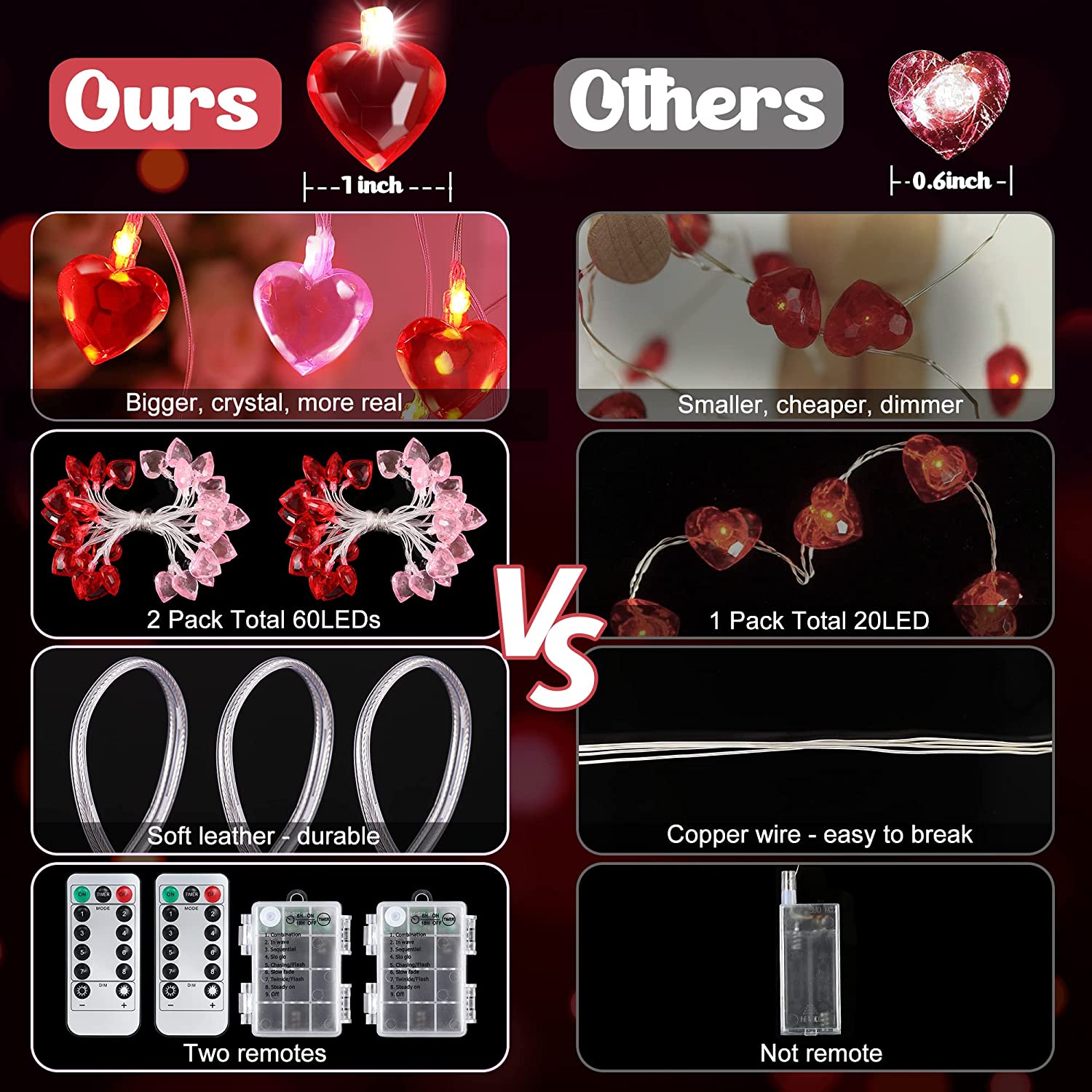 - More Hearts, More Love: you will receive 2 pack, total 60 hearts, 30 hearts in a bunch; Our Valentines day decor heart string lights are designed with unique red and pink 3D diamond cut heart, crystal clear, glitter in all directions, symbol of eternal love for your lover