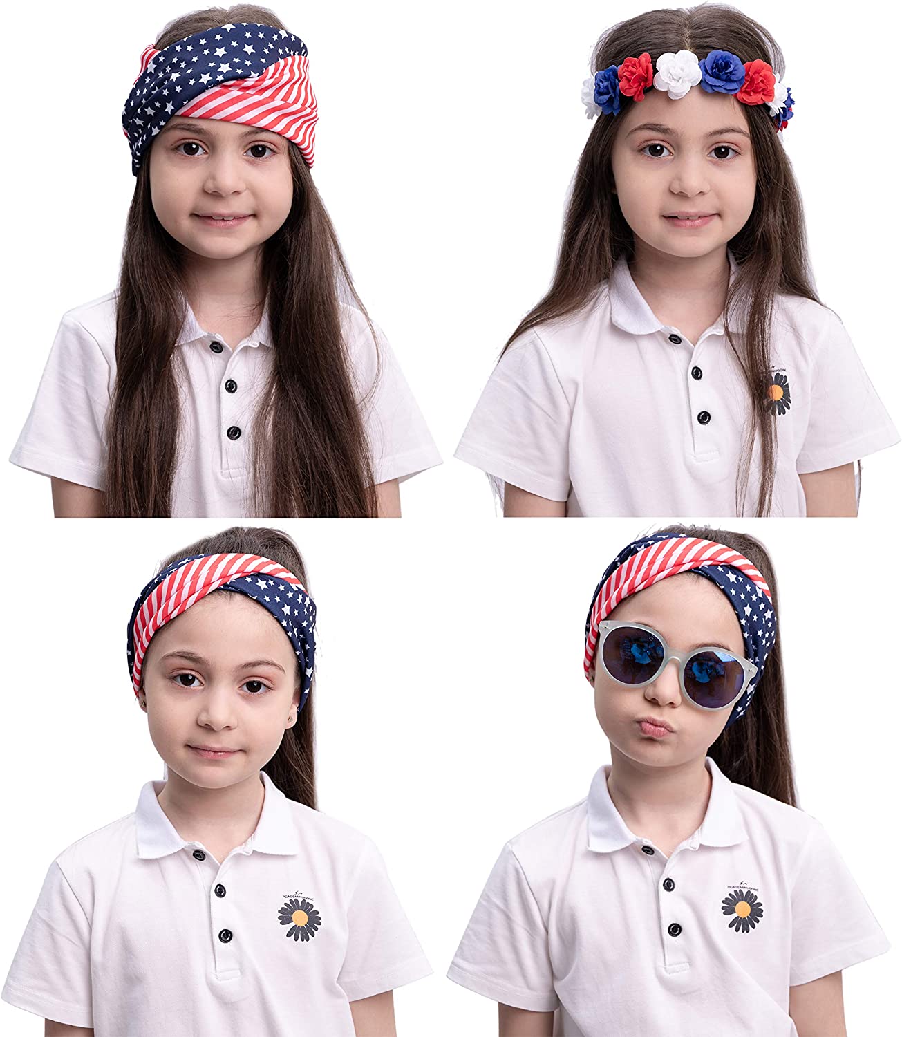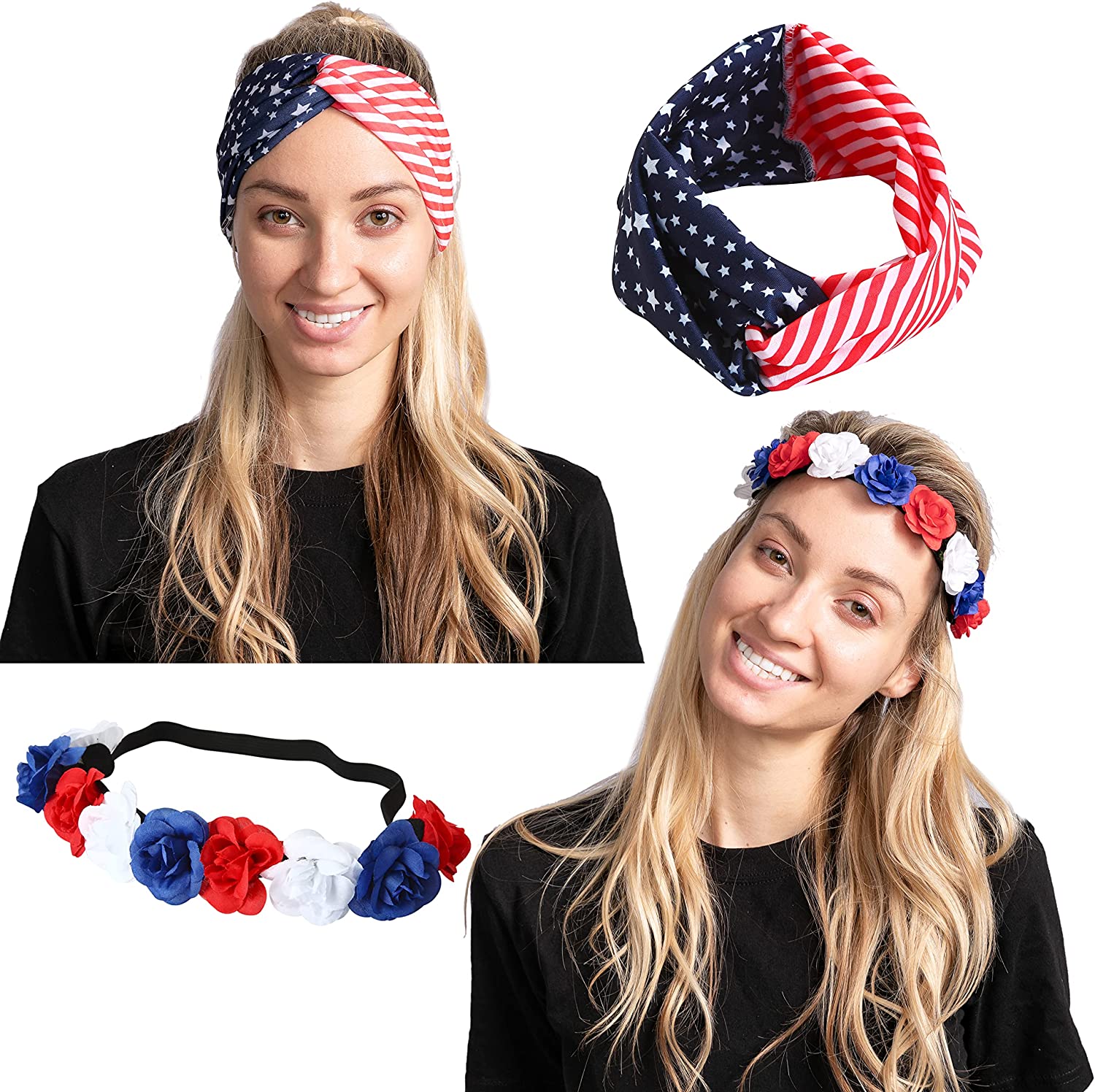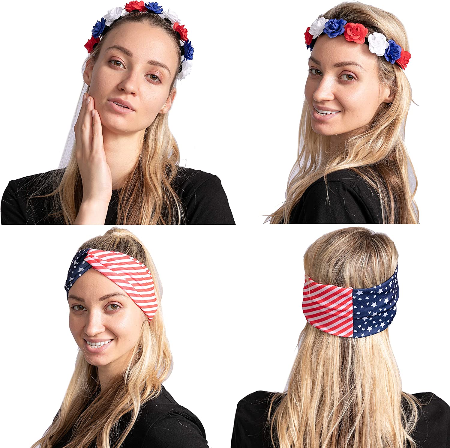 - COMPREHENSIVE SET. Our 4th of July accessories set includes a US american flag-themed headband, and a flower headband with 9 red white and blue headband flowers. Celebrate with style!