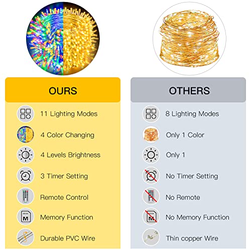 - đă11 Lighting Modes with Remote ControlăOur multi colored Christmas lights with 4 steady-on modes: warm white+3 types of multicolor. And 7 blinking fairy lights setting: Slo-Glo, Breathing, Warm white Slo-Glo, Multicolor Slo-Glo, Flash, In Wave, Combination. The multicolor Christmas lights more lighting choices than the other 8 modes. The remote control can be sensitive within 16ft and is very convenient to use.