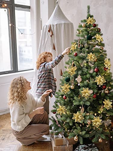 - ♔EASY TO ASSEMBLE AND PLACE-Floweroyal artificial Christmas flowers come with pretty sturdy metal clips and flexible green stems so you can put poinsettias on however you want. The clip can be inserted into the poinsettia stem hole, which can be easily attached to the Christmas tree and add a bit of sparkle I was looking for. You can also insert green stems into poinsettias to create your own special floral art.