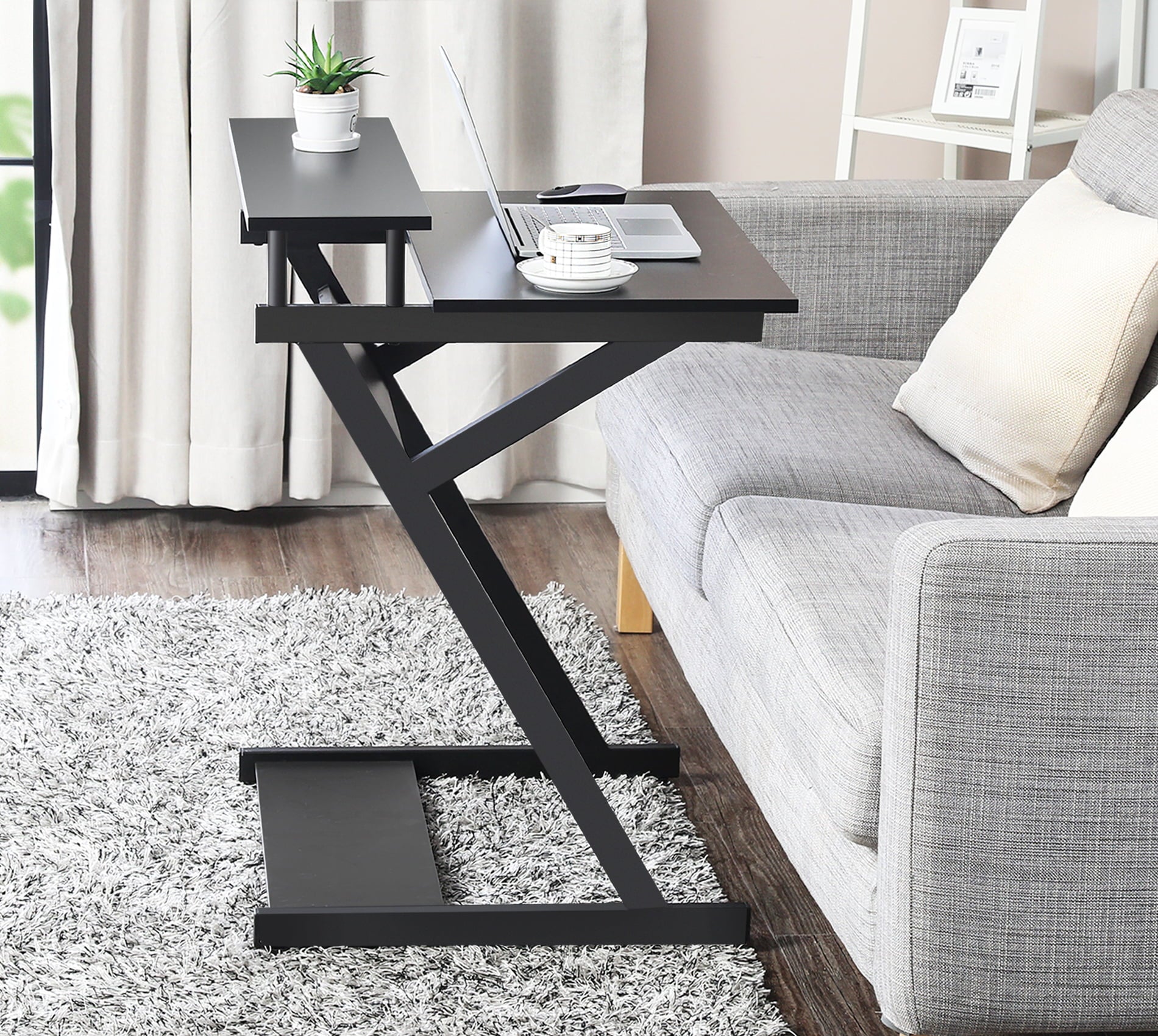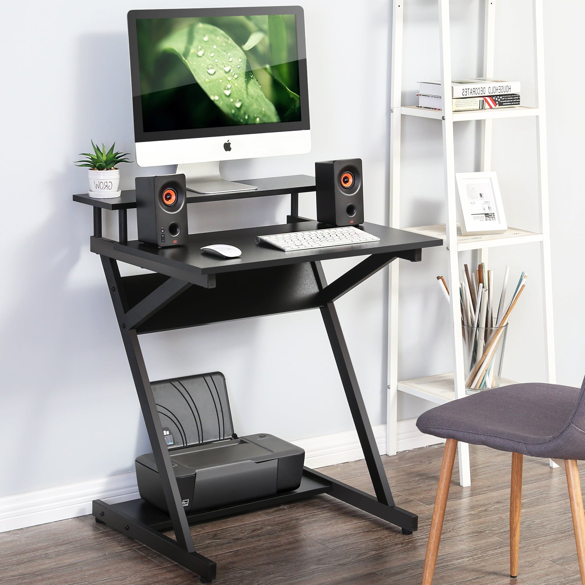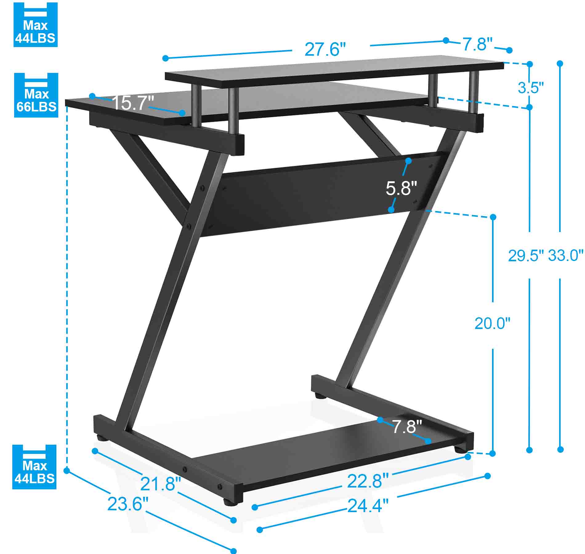 Monitor shelf of computer desk reduces fatigue of eyes and spine and create more comfortable visual effect for students and office workers. 29.5 inches from tabletop to floor, PC desk can meet the height of most chairs and bring comfort to human body.The compact design creates the perfect solution for small spaces and perfectly works as gaming desk/ study desk/student desk/office desk/corner desk. 【2-MONITOR SHELF】this one equipped with an extra-level shelf for 2 monitors. You can place monitor or laptop on top-level and keyboard and mouse on the lower-level.【BOTTOM STORAGE SHELF】Desktop length: 27.6". Desktop depth: 15.7". Desktop height: 29.5". Monitor shelf height: 3.5".【MONITOR SHELF】You can place monitor or laptop on top-level and keyboard and mouse on the lower-level.Weight capacity: 22 lbs. It is sturdy enough to hold your monitor.