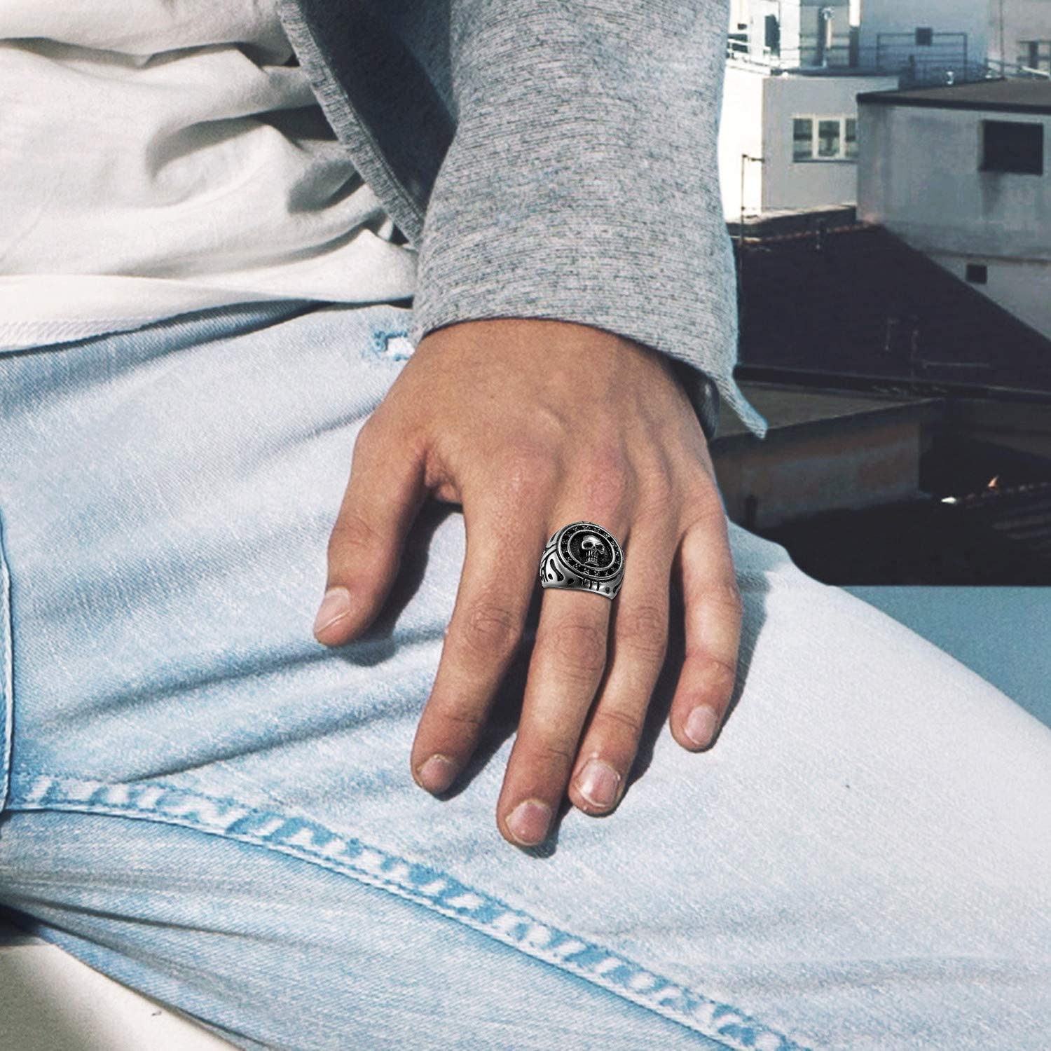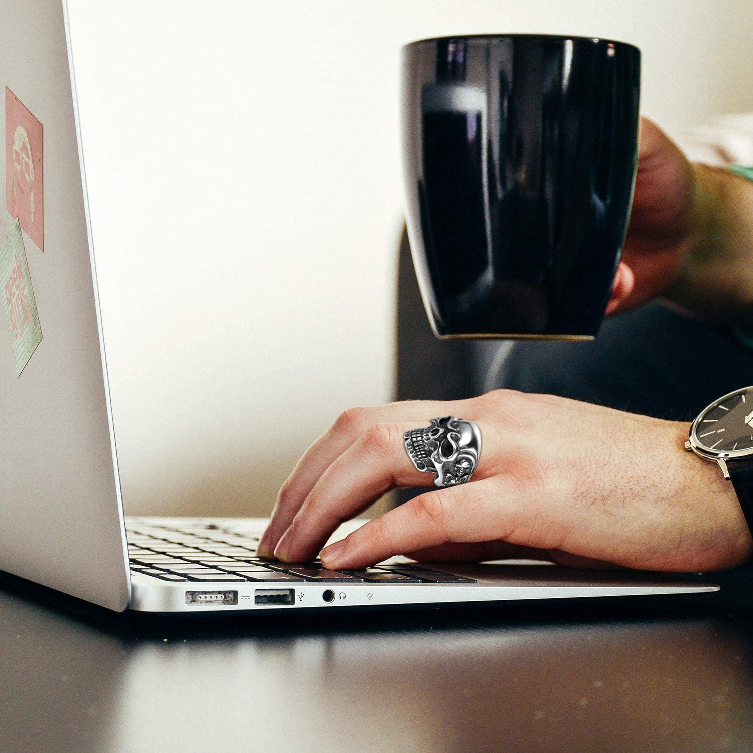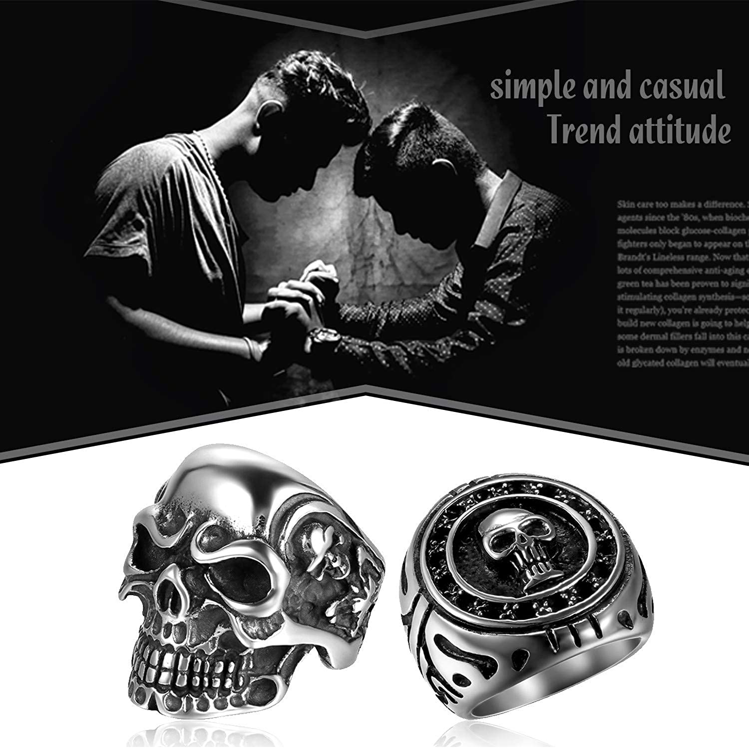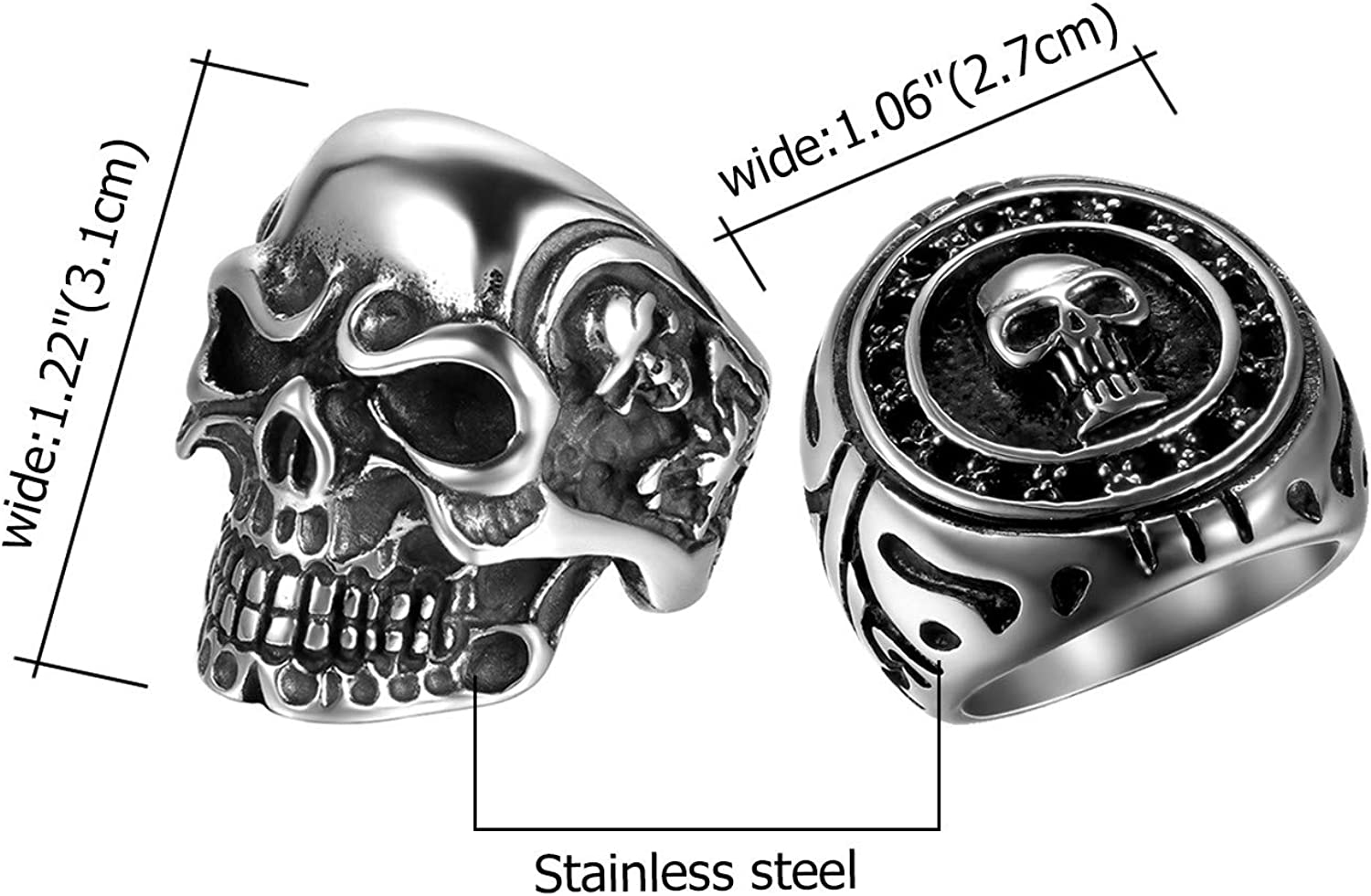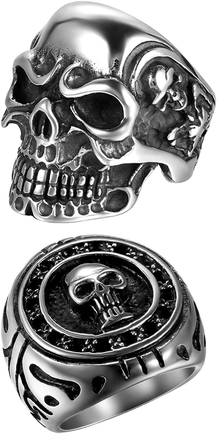 2Pcs Bikers Stainless Steel Gothic Skulls Ring,Black Silver, Size 8-15
