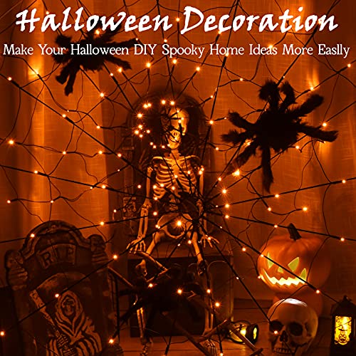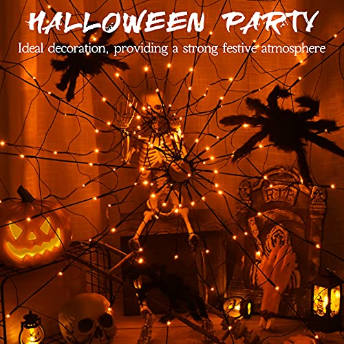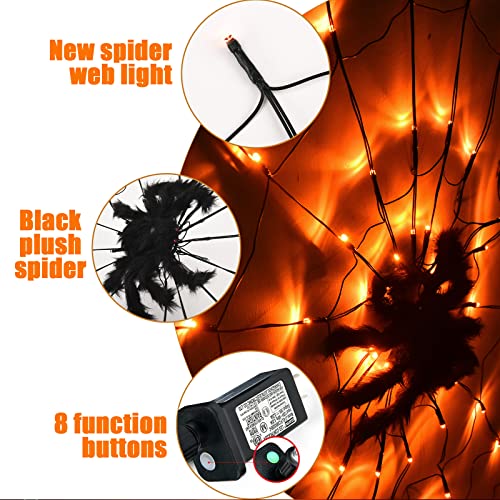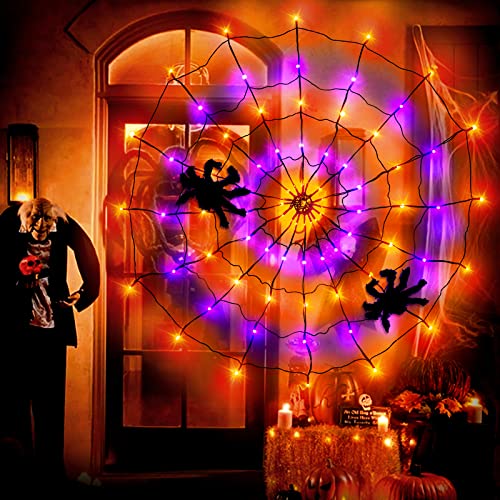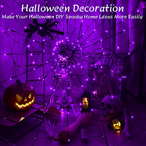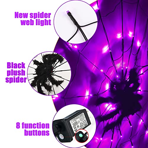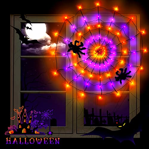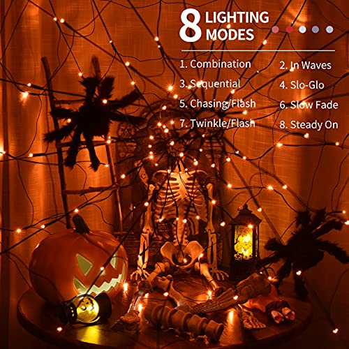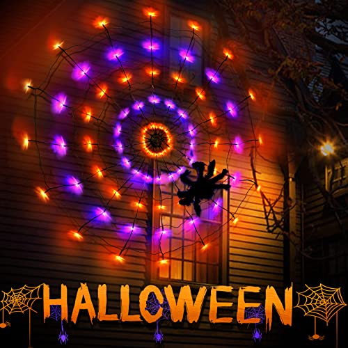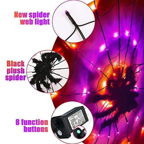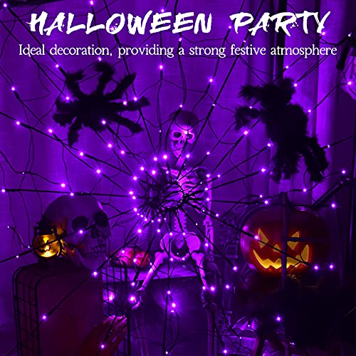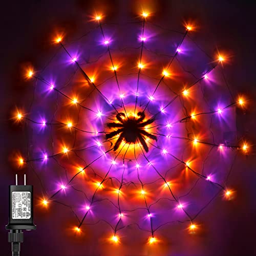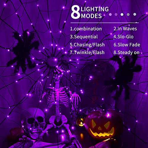 - Orange Purple Lights for Halloween Decorations - This Halloween lights use Super Bright with Upgraded Bulbs, Safer Plug in(UL588 Approved), Waterproof, 8 Lighting Modes, timer, 80 LEDs orange purple web lights with spider