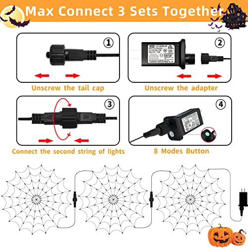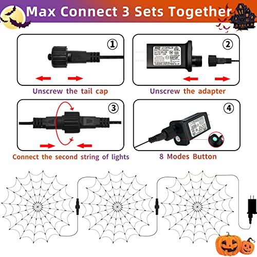 - Waterproof - Our Halloween web lights have passed IP65 waterproof certification. It's perfect for outdoor use without getting damaged,including heavy rain and snowy conditions ( The power adapter is not waterproof, should keep it dry when used outdoor)
