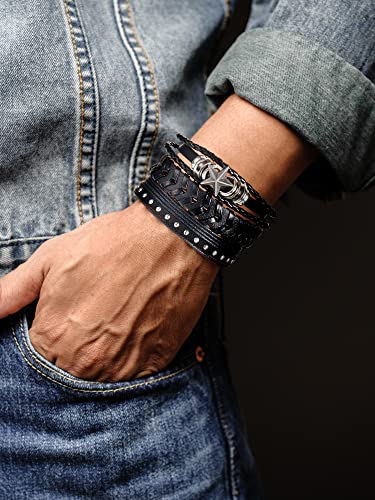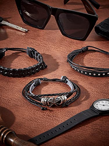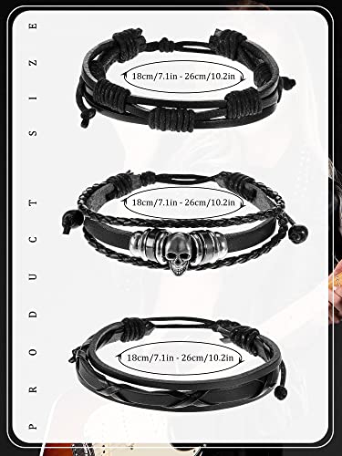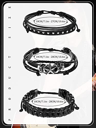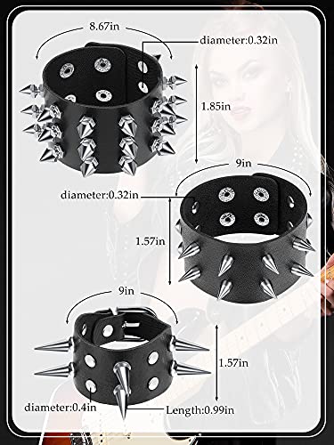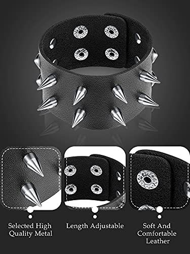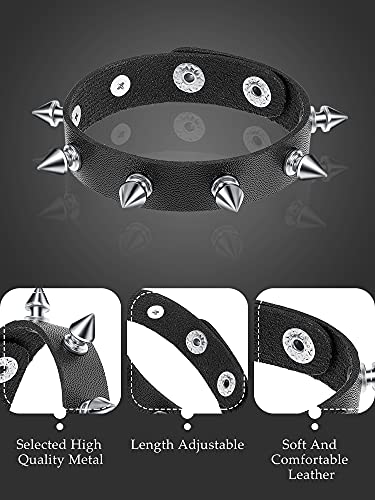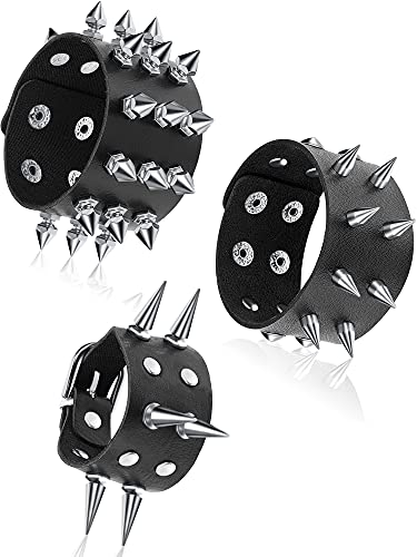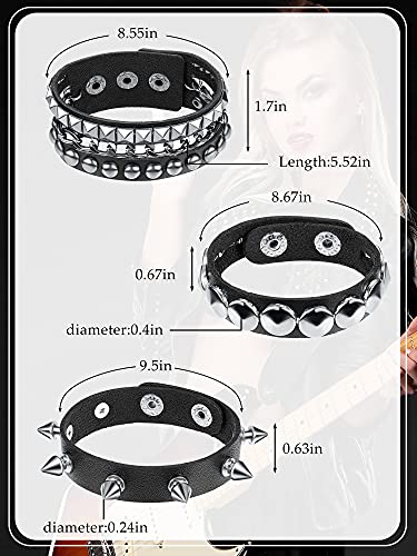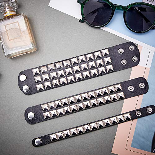 - What can you get: the package comes with 3 pieces black leather studded bracelets, each punk bracelet is different from another, which contains single layer, double layers and triple layers spike rivet cuff bangle, enough quantity and style to satisfy your various needs