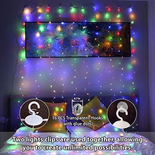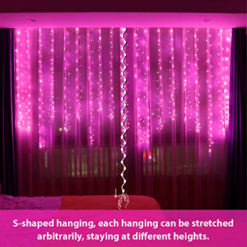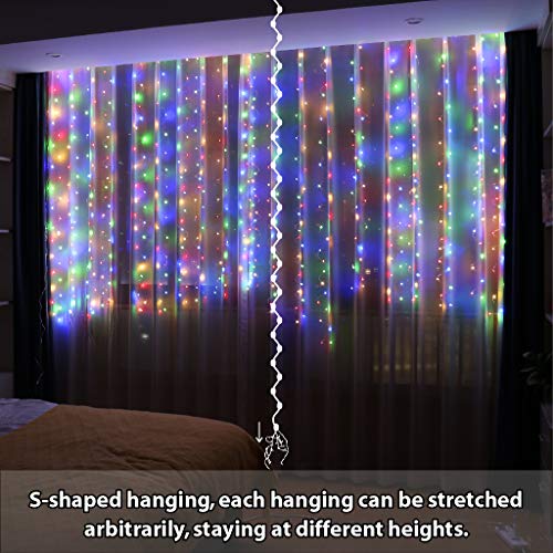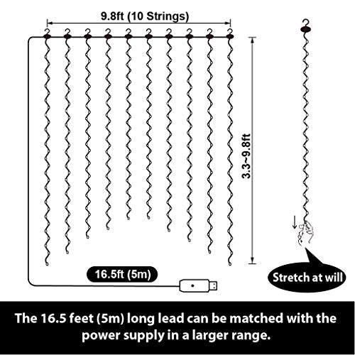 - · 【16.5ft Lead wire】: 300 individual LEDs, 9.8ft.x9.8ft curtains lights come with extra 16.5ft long power cord. 9.8ft main strand and 10 drop strings included hooks. Copper wire drop strings is tough & flexible, hanging & adjustable desired height naturally easily. No limits to your imagination, Do the shape you like. Enjoy a fairytale world ( Curtain is NOT included).