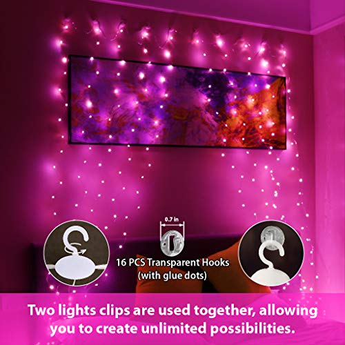- · 【360° Rotatable hooks】: Upgrade 360° Rotation Clips on each drop string is mainly used for hooking on curtains. It can be hung at any angle, such as on wall, window or other surface. Also includes 16 sets of Damage-free adhesive hooks. No nails needed and holds strongly & removes cleanly. Both of these two clips make the curtain light easily to be hung for some special places, not only limited to windows, but also can be hung on flat walls, glass, porches, eaves, etc.