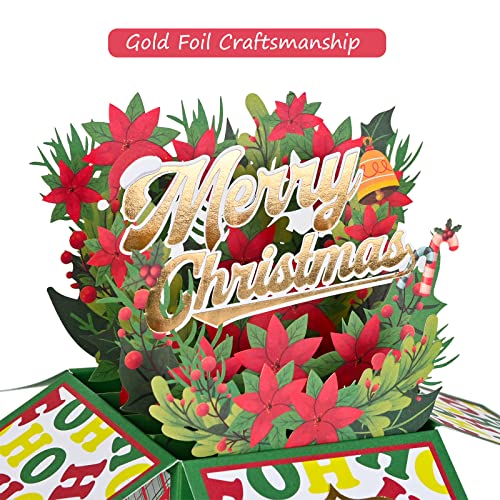 - Beautiful Winter Card cover features accented with Grid pattern gold foil patch. Inside design poinsettia flower, holly berries, greenery rests and "Merry Christmas" lettering along in a box! An intricate metallic foil Christmas pop-up card, perfect for sending Christmas wishes to your loved ones.