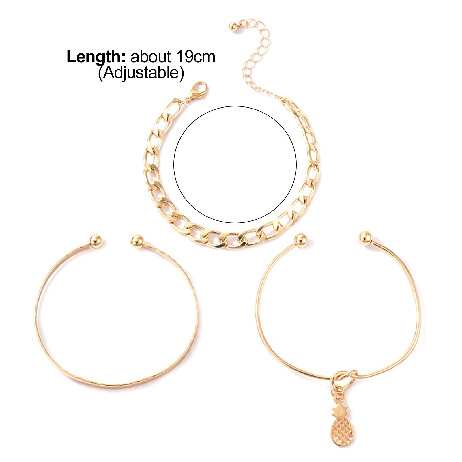 Adjustable chain and open-ended design allows free adjustment for tightness. Alloy structure design makes it lightweight and anti-wear. Pineapple pendant design brings a fashionable and chic look. Multi styles a set design allows you to stack it or wear it alone. Made of premium alloy material, it is durable. The chain length is 19cm. It is suitable for anniversary gift, birthday gift or daily wear, party, etc. Item Name: Bracelets Material: Alloy Gender: Women Features: Pineapple Pendant, Open Ended, Lightweight Size Details: Chain Length (Adjustable): 19cm/7.48" (Approx.) Notes: Due to the light and screen setting difference, the item's color may be slightly different from the pictures. Please allow slight dimension difference due to different manual measurement. Package Includes: 3 x Bracelets *- It is suitable for anniversary gift, birthday gift or daily wear, party, etc. *- Adjustable chain and open-ended design allows free adjustment for tightness. Alloy structure design makes it lightweight and anti-wear. *- What makes it lightweight and anti-wear is the alloy structure design. It allows free adjustment for tightness because it is designed with adjustable chain and open-ended. *- Featuring an alloy structure design, it is lightweight and anti-wear. Since it is designed with adjustable chain and open-ended, it allows free adjustment for tightness. *- It is lightweight and anti-wear because it is designed with an alloy structure. What allows free adjustment for tightness is the adjustable chain and open-ended design.