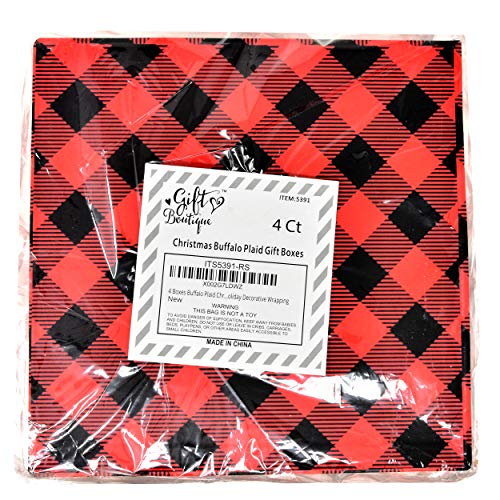 An Adorable Way To Present Your Holiday Gift. Now that you have found the perfect Christmas gifts, present them in extraordinary gift boxes! 4 Piece Buffalo Plaid Gift Boxes are sturdy enough to be used for holiday seasons to come. Stack these gift boxes under your tree, or anywhere in your home for a beautiful holiday display. 4 holiday boxes per package. Boxes are tower style, 4 different sizes. Christmas gift boxes range in size from approximately 6 x 5 1/2 4 1/2 x 4 across the top. Candy cane striping. Each box is decorated with a red ribbon. Make those hard to wrap presents beautiful instantly this Christmas with affordable holiday gift bags and boxes. Keep Christmas wrapping supplies on hand for any last minute presents throughout the holiday season.