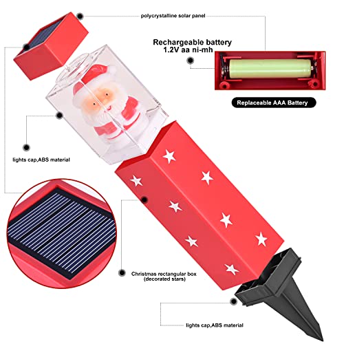 - 🎅【Unique Christmas Decoration】Christmas solar pathway lights have unique Santa interiors decorations, have replaceable Christmas tree lights, Christmas tree and Santa Claus can be replaced with each other, You can freely match according to your own. The exquisite 3D Santa Claus design and handicraft colors are meticulously crafted, with white LED lights, to add more Christmas atmosphere to your garden.