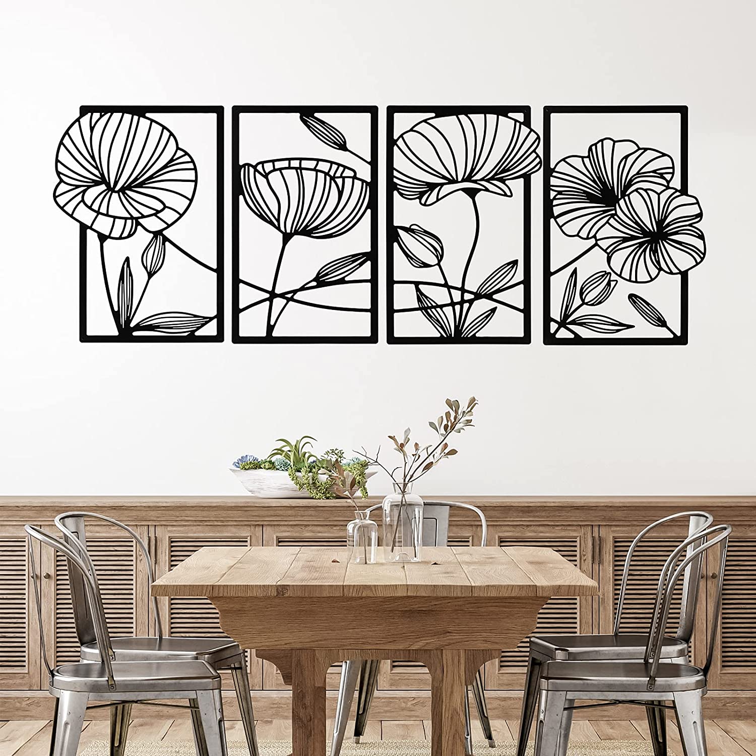 4 Pcs Metal Line Art Wall Decor Metal Flower Minimalist Sculpture Modern 16.5x11.9in (Black)