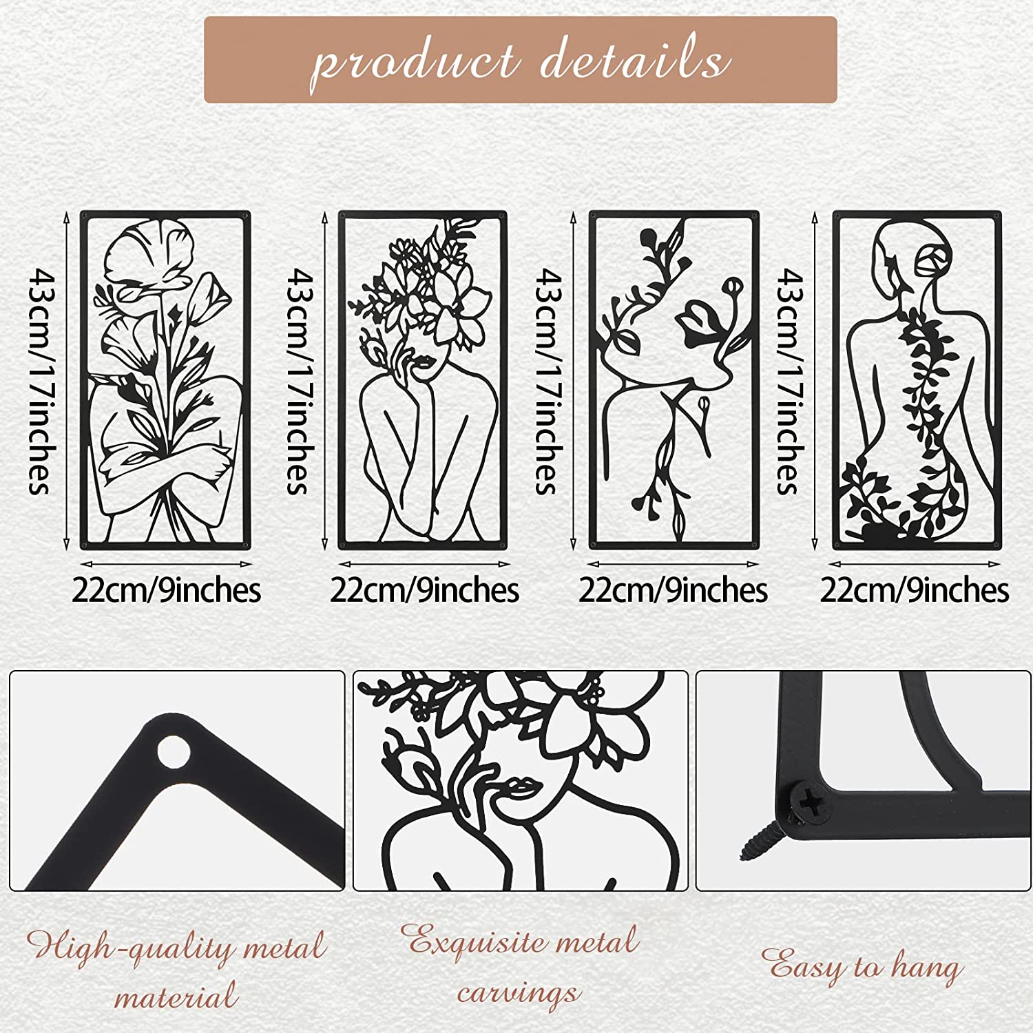 - Metal Minimalist Abstract Woman Wall Art: there are 4 pieces of minimalist black metal wall arts in different styles, offering you enough quantity to satisfy your everyday home adornments, with black color, they can match well with most of your home settings as well
