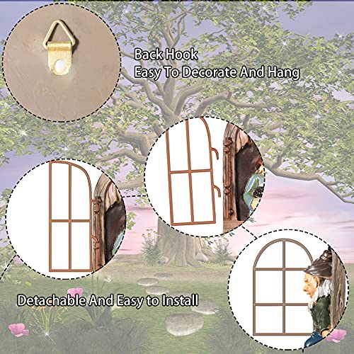 - Add interesting to your garden: you can hang these cute garden statue gnomes on your tree or fence that appear to be climbing out of a wooden window then down the ladder, plus a swinging metal windowpane which enhances a sense of reality to the sculpture furthermore; This combination is a nice way to add personality to any tree or to add interest to ordinary fences