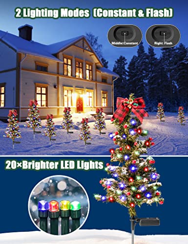 - 【Constant & Flashing Light Modes】Upgraded solar outdoor Christmas tree has two attractive light modes: constant & flashing. You can toggle the switch at the bottom of the solar panel to choose the effect you like. You'll easily get compliments from your neighbors and guests on these solar Christmas pathway lights! We recommend you buy more sets.