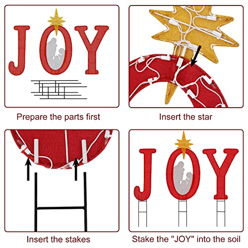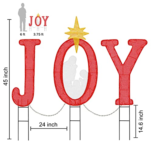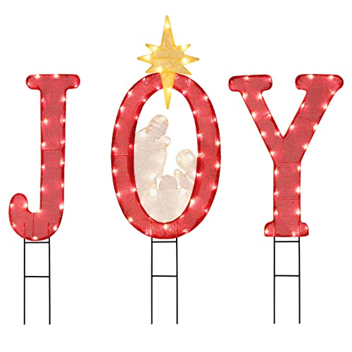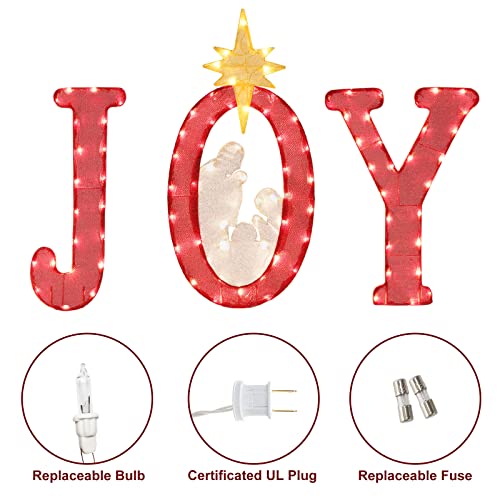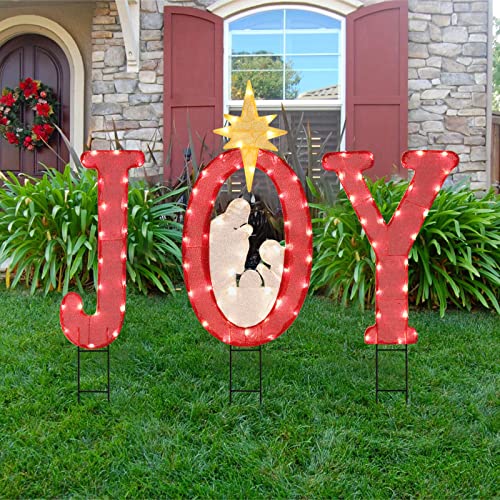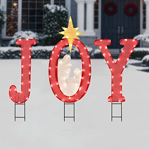 - Pre-Lit 2D Silhouette JOY: This Pre-lit JOY lighted display stands 37'' tall, features the letters that spell out the word with a silhouette of the Holy Family and the star on the "O". The red color joy greetings and golden star pattern bring a festive sense of ceremony.