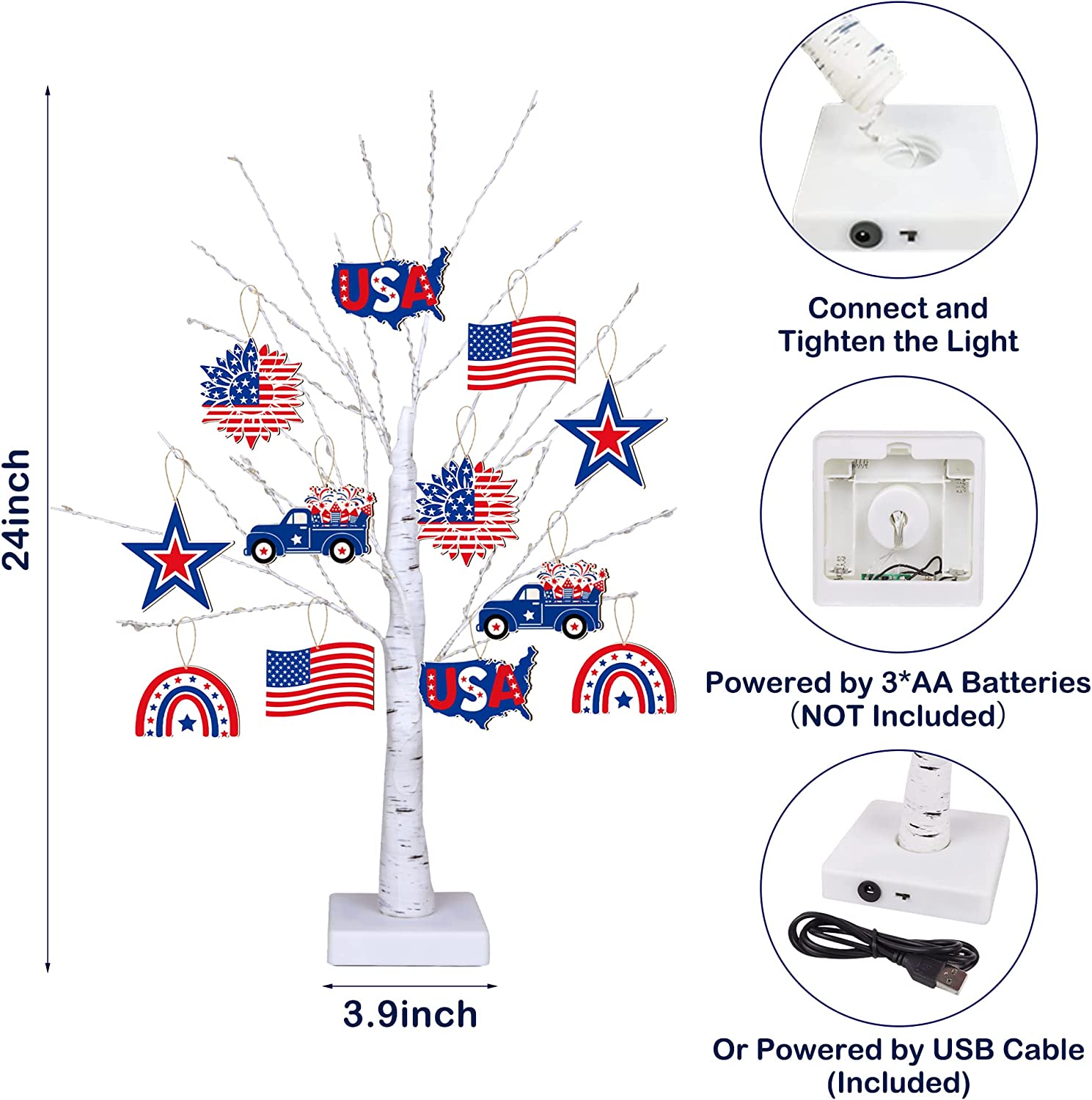 - 【USB & Battery Powered】 ---There are 2 power ways for this Fourth of July tree light: powered by USB cable (included), or 3 AA batteries (batteries not included), easily set it anywhere to add more patriotic feel to Fourth of July celebration!