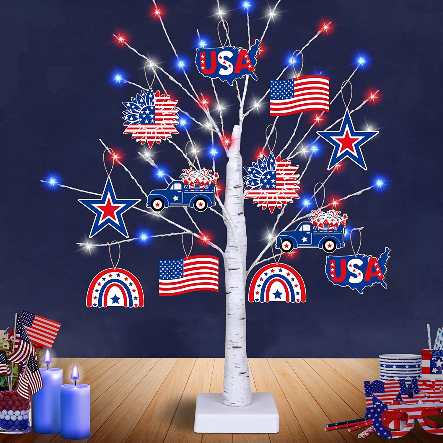 - 【4th of July Decorations Tree Light】---You will get 24 INCH red white blue light tree and 12 pieces wooden patriotic ornaments.This tabletop tree is the perfect addition to any patriotic theme décor. Use it as a table centerpiece for living room, bedroom, office as addition to everyday decorations, or as an eye catching piece to any patriotic holiday.