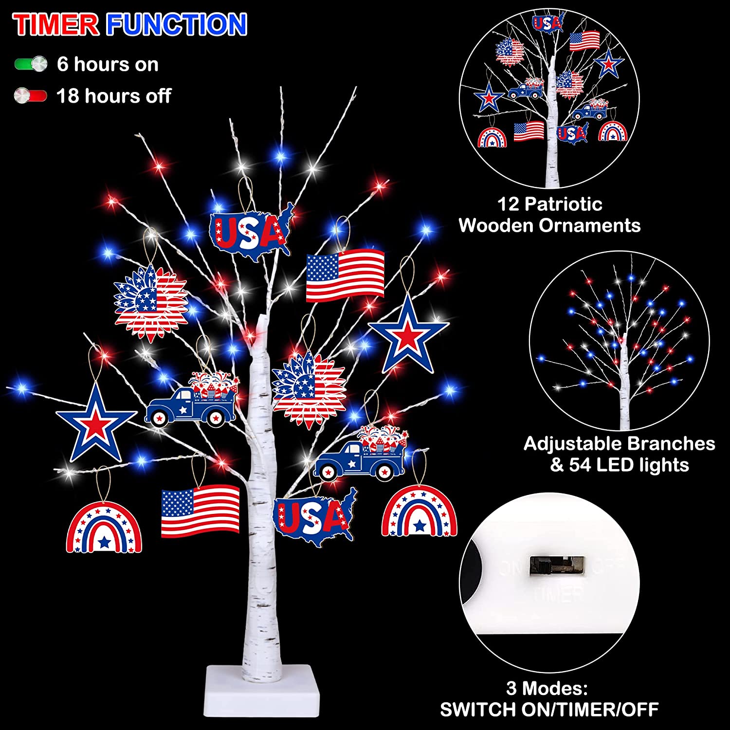 - 【Timer Function】--- You can use the switch on the base to set Timer Mode so that the light automatically turns on for 6 hours and off for the next 18 hours. Add this patriotic 4th of July light to your home for a pop of color, brilliance, and a festival touch for Fourth of July party decor.