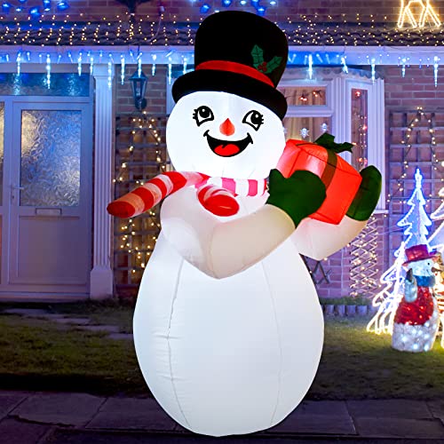- đăExcellent Craftsmanshipă Snowman with Gift Box inflatable are made of high strength waterproof polyester which is against rips and tears, the excellent stitching improves the durability of the inflatable decoration. In addition, this outdoor inflatable is providing with a powerful-duty blower to continuous airflow inflate the decoration, it also come with a storage bag for you.