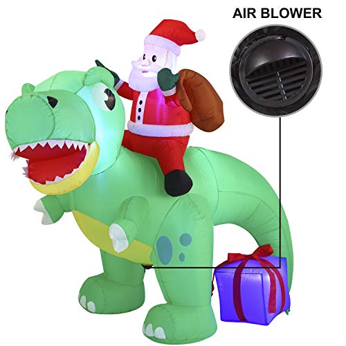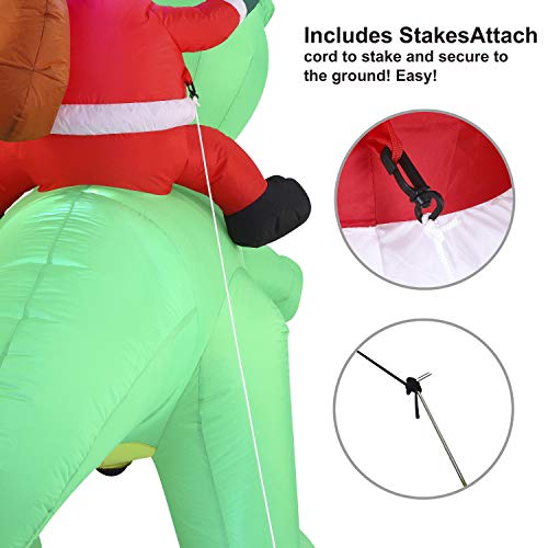 - 6 ft. Long Santa Ride on Dinosaur Inflatable comes with an extended cord, ground stakes, fastened ropes, built-in sandbags, and a plug with UL certification.