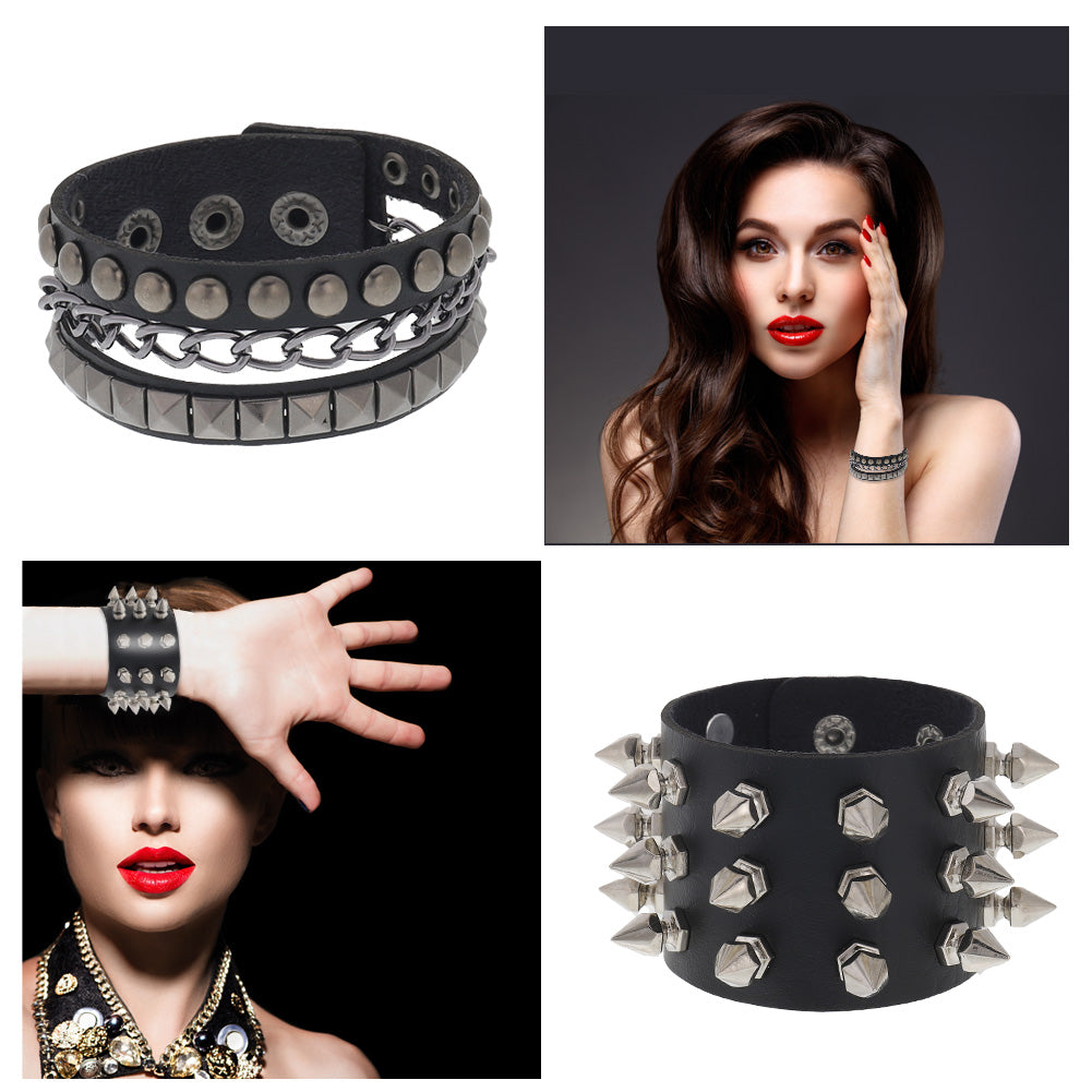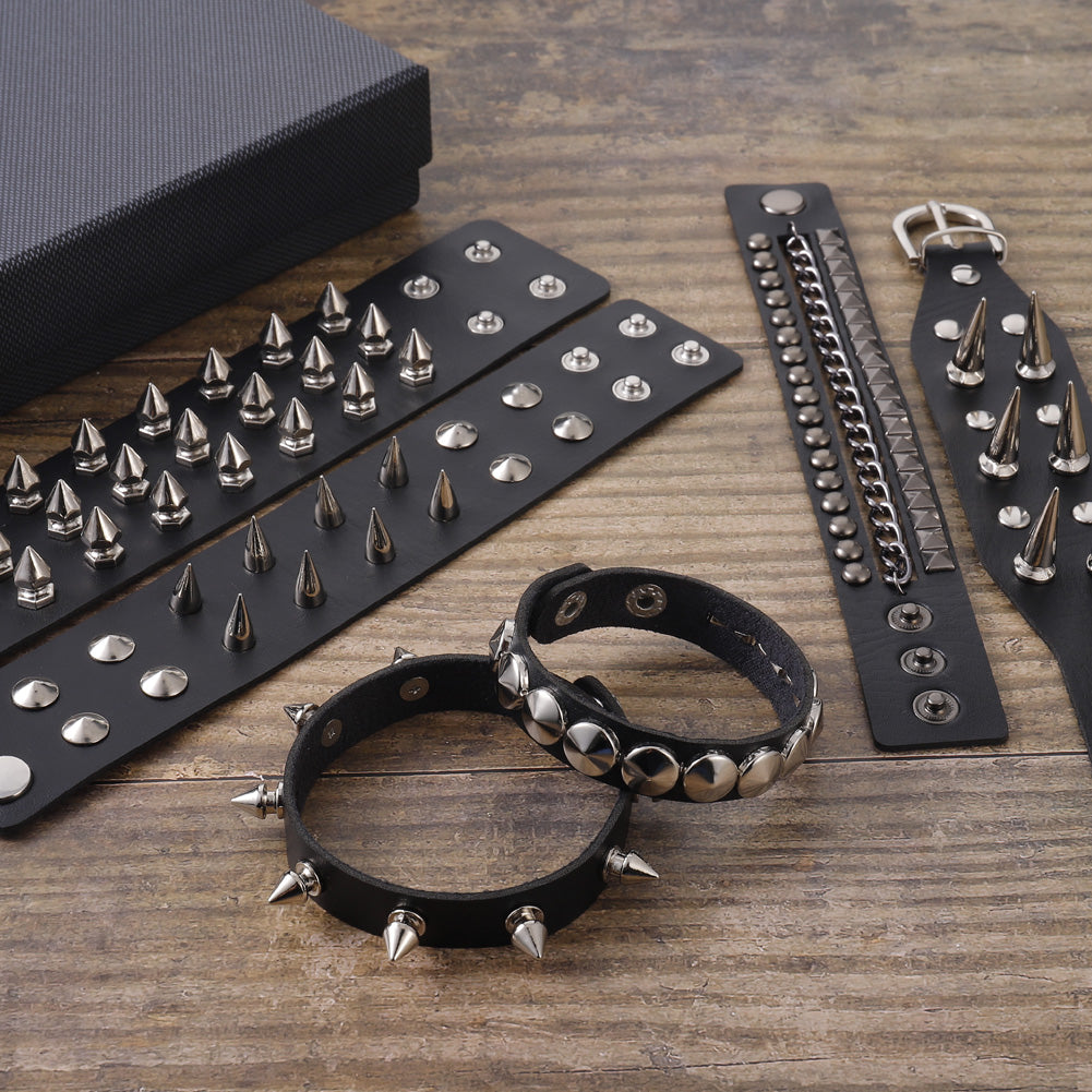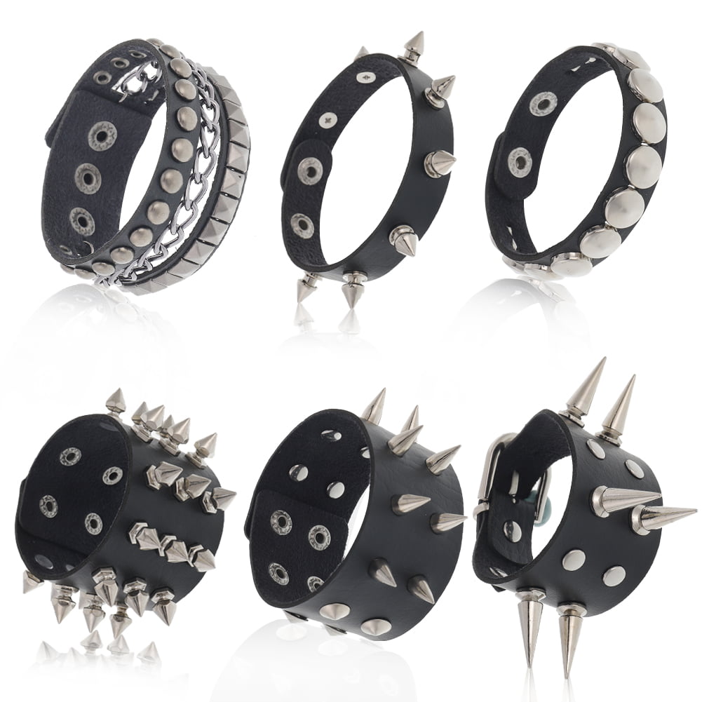 Package Includes Package comes with a set of 6 pieces black leather bracelet, each bracelet is different from another, enough quantity and style to satisfy your various needs. Fashion Punk Style The style of thick leather bracelet is unisex punk rock biker style with wide strap. You will get the compliments. These punk style bracelets design with rivets, the rivets are in different sizes, which look so cool. Stylish and cool design makes you stand out from the crowd. Comfortable to Wear These bracelets are made of artificial leather and alloy, that are safe and durable, not easy to get rust or corrode, hard-wearing material support you to wear for a long time. Suitable Occasions You can wear these punk style chokers to attend concert, birthday parties, proms, festivals, or as daily wear. Also can be accessories for LARP, teenagers/adults, cosplay, All Saints Eve, Halloween, fancy looks, a Cossack costume, nativity costumes, and historical reenactments. Nice Gift The studded bracelets are very popular among cool girls or boys, you can send this set of punk rivets bracelet to your friends as a Christmas gift, New Year gift, or birthday gift to make them happy. Details Materials: Leather Weight:148g/0.33lb Color: Black/Silver Product Include 6*Punk Studded Bracelet Precautions Due to manual measurement, please allow slight errors in size. Please take off the bracelet when you are showering or swimming, avoid touching water and clean it with soft cloth. *- Long time to use and neatly cut a better sense of wear. *- Not easy to fall off. *- The cortex is pure black, surface smooth and not rough. *- Alloy plating, color preserving for a long time. *- It's well worth it. Don't hesitate, just do it.