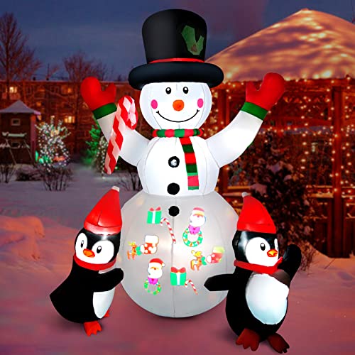 - 【Rotating Christmas Patterns and Bright LED Lights Create a Festive Atmosphere】This Christmas inflatables snowman and penguins has built-in 4 white lamp beads and 1 projection lamp. When plugged in, Christmas patterns will appear on the snowman inflatable, such as Santa Claus, gift boxes, Christmas socks. The changing patterns create a cozy and exciting Christmas atmosphere at night, which easily catch the eyes of children, neighbors and guests.