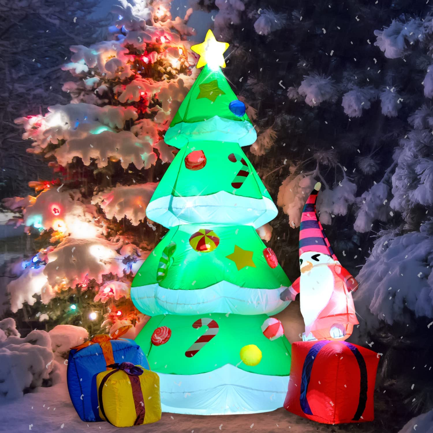 - 【Giant Inflatable Christmas Tree】7 Foot inflatable Christmas tree designed with 3 multicolored wrapped gifted box and a gnome in one piece. Bright LED lights inside will light up through the whole night for the best attraction to neighbors and guests.
