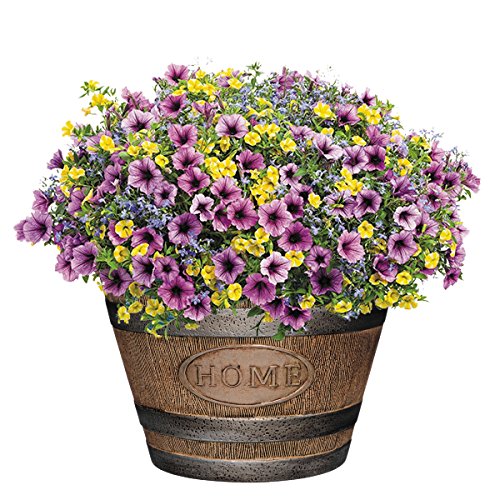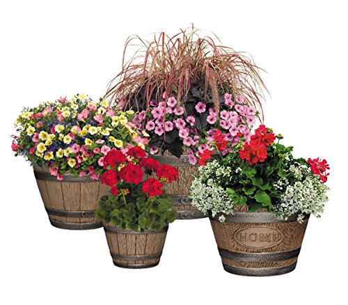 - Classic whiskey barrel planter in a Distressed Oak finish with antique pewter colored bands. A raised and weathered "home" Placard done in the same colorway as bands adds character.