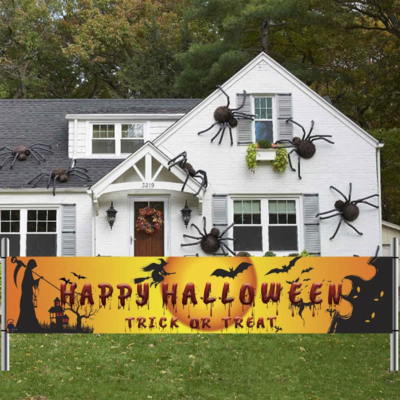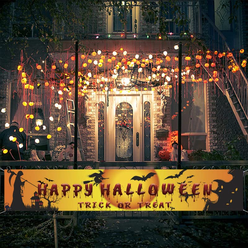 - Easy TO INSTALL- There are holes in each of the four corners with 4metal grommets of this happy Halloween banner. You just need to take a few minutes to string them up with ribbons, and hang it on the tree, on your yard, on your fence, ceiling, in a doorway, window, archway and any place your want, or as a backdrop when you take photos.