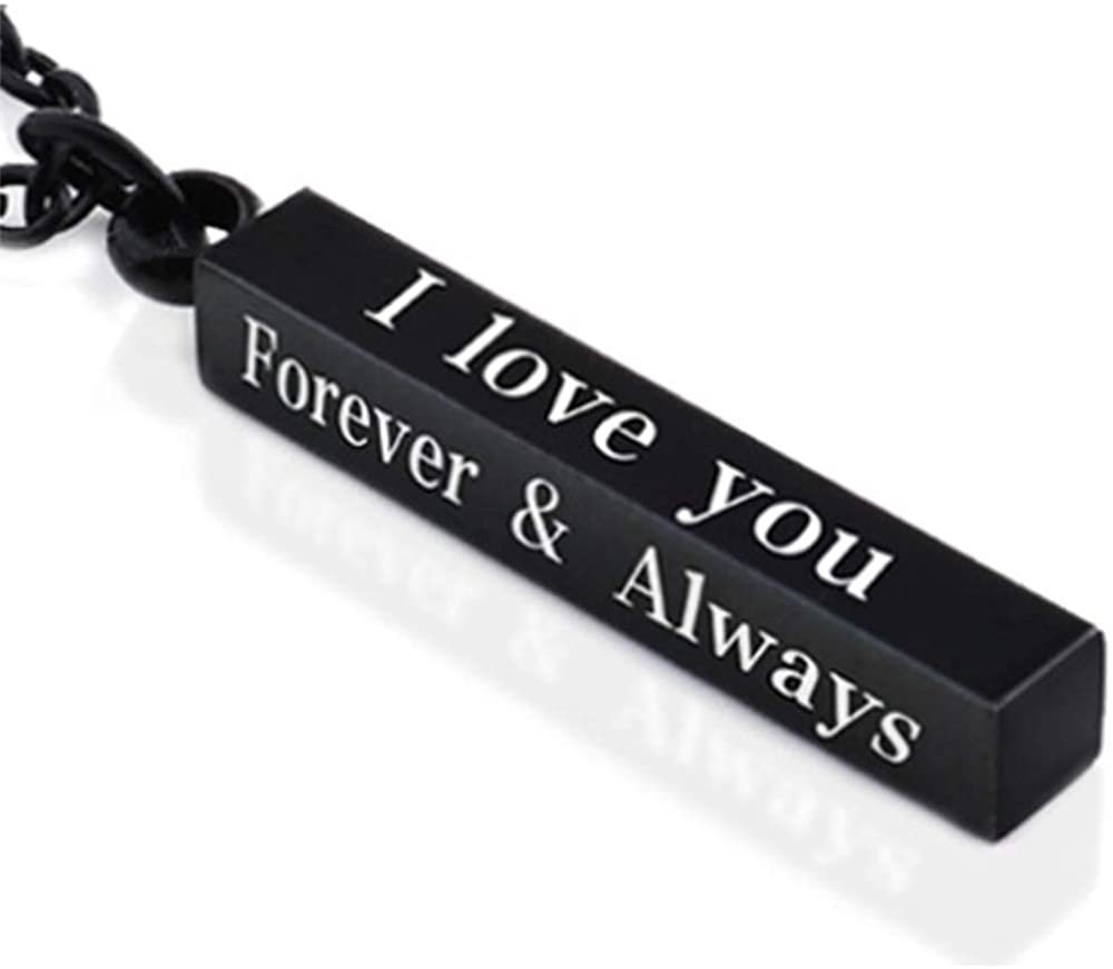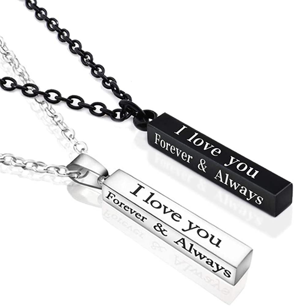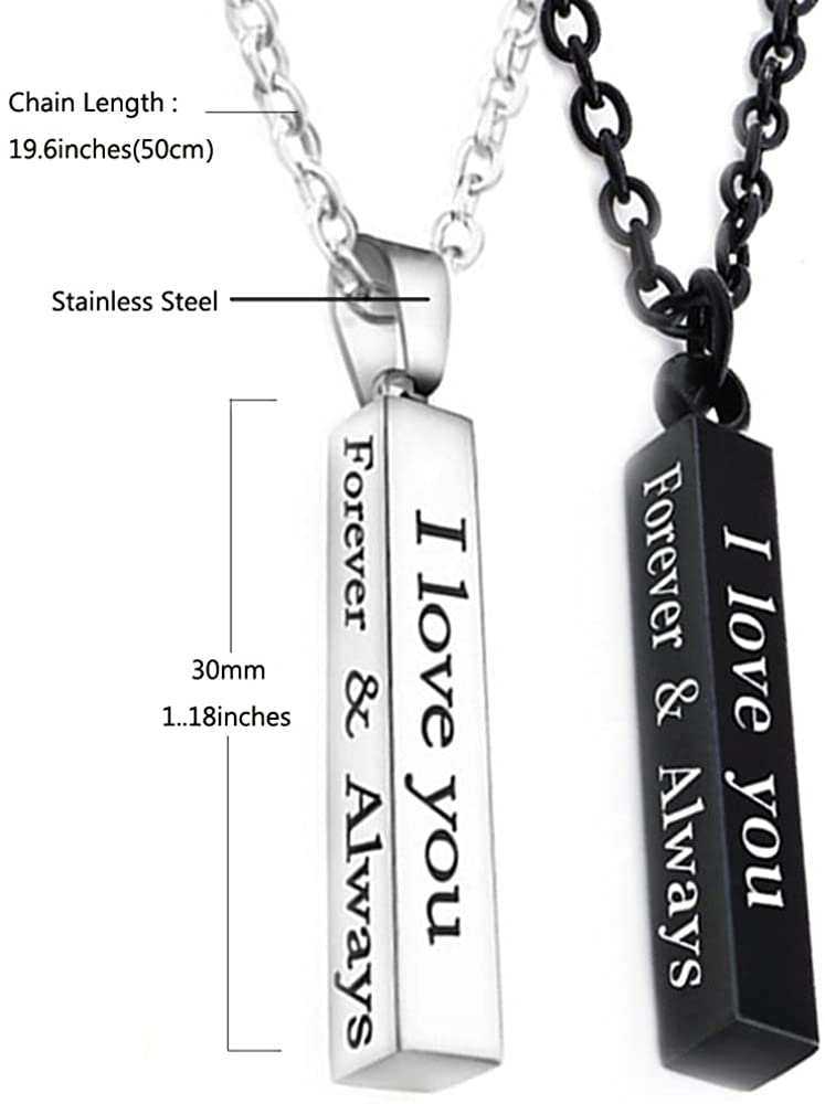 This romantic matching i love you couples necklaces with letter forever &Always engraved design, especially suitable as a valentine's day gift for your boyfriend, girlfriend, husband and wife. Product Name: I Love You Forever &Always Necklace For Couples Set Material: Stainless Steel Style: Romantic, Goth, Simple. Chain Length 19.6inches(50cm) Pendant:1.18inches(3cm) Packing List: A Pair Of Couples Necklace This relationship couples necklace is especially suitable for your him, her, boyfriend, girlfriend, husband wife, best friend, as a birthday, valentine's day gift, new year gift, friendship gift. I Love you couples necklace Forever Love on your side. Let it to witness and guard your love. A : Sure, This is a good present for lovers, boyfriend and girlfriend, husband and wife as a wedding gift, valentine's day gift, anniversary gift. *- 1.This romantic and fashion pillar couple necklace has a "I love you always forever" lettering design, Design meaning: eternal love. you can give this matching promise i love you forever necklace to your girlfriend or boyfriend to express your deep love for her/him. *- 2.MATERIAL -- Made of high-quality stainless steel, non tarnish, sturdy, durable, hypoallergenic, lead-free and nickel-free, Can be used for a long time. *- 3.SIZE -- The matching relationship promise i love you necklace chain length 19.6inches(50cm), pendant:1.18inches(3cm), this size fits most people? necks. *- 4.AS A GIFT --This romantic i love you necklace is especially suitable for Sister and brother-in-law, girlfriend and boyfriend, husband and wife as a valentine's day gifts, new year gift, engagement gift.
