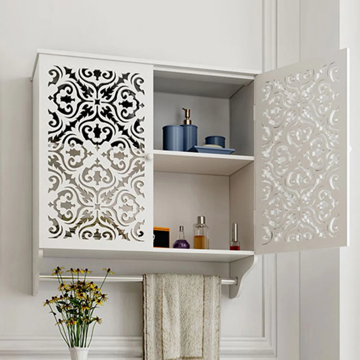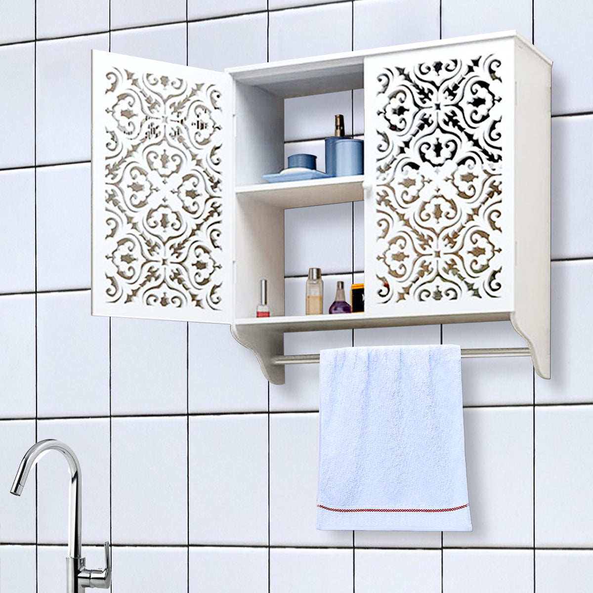 Bathroom Wall Mounted Cabinet Double Door Vanity Storage Cupboard With Towel Rod Easy Install, White, 17.32 x 8.66 x 17.72 inches *- Hide toiletries and other bathroom items behind cabinet doors for a clean presentation. *- Can be wall-mounted, which makes it space-efficient and provides free ground space saver for other storage needs. It provides a neat and clean look to most bathrooms. *- Carved pattern design. Designed with towel rod. *- Easy to install. Package Included: *- 1 x Bathroom Shelf *- (Other things in the pictures is NOT included) Specification: *- Color: White *- Material: PVC *- Size: 17.32 x 8.66 x 17.72 inches Note: *- Due to different producing batches, product details might be a little different. If you minding the difference, please buy it carefully. *- Please allow 1-3CM to differ due to manual measurement. *- Due to the different displays and different lights, the picture may not reflect the actual color of the item. Thanks for your understanding.