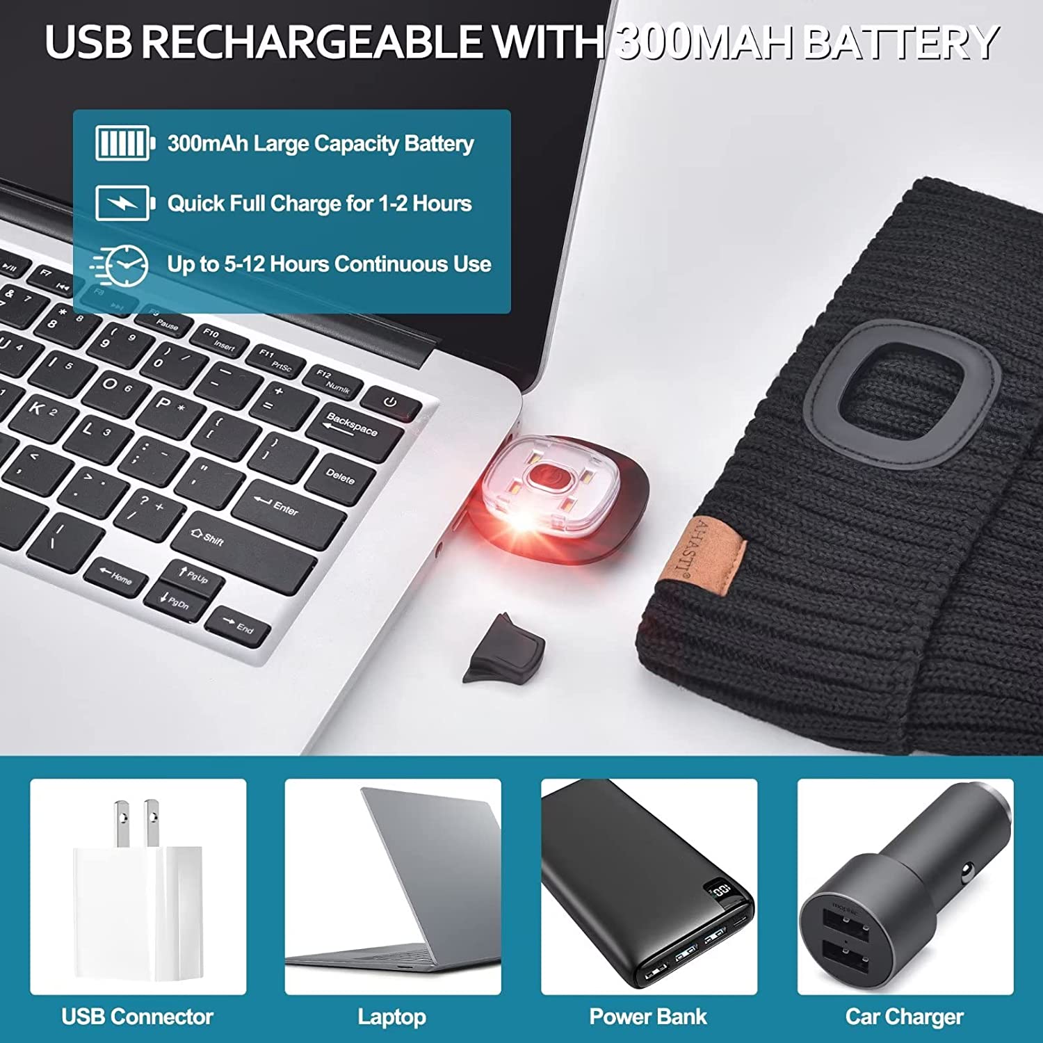 - [High Capacity Battery & Easy USB Rechargeable]: The headlight beanie is equipped with a energy-saving USB rechargeable LED light. It is 300mAh large capacity battery, just take about 1-2 hours to fully charge, but long-lasting for 5-12 hours continuous use, which depends on different level of brightness. And it is convenient to charge in any USB power socket, laptop, car charger, power bank, socket, etc.