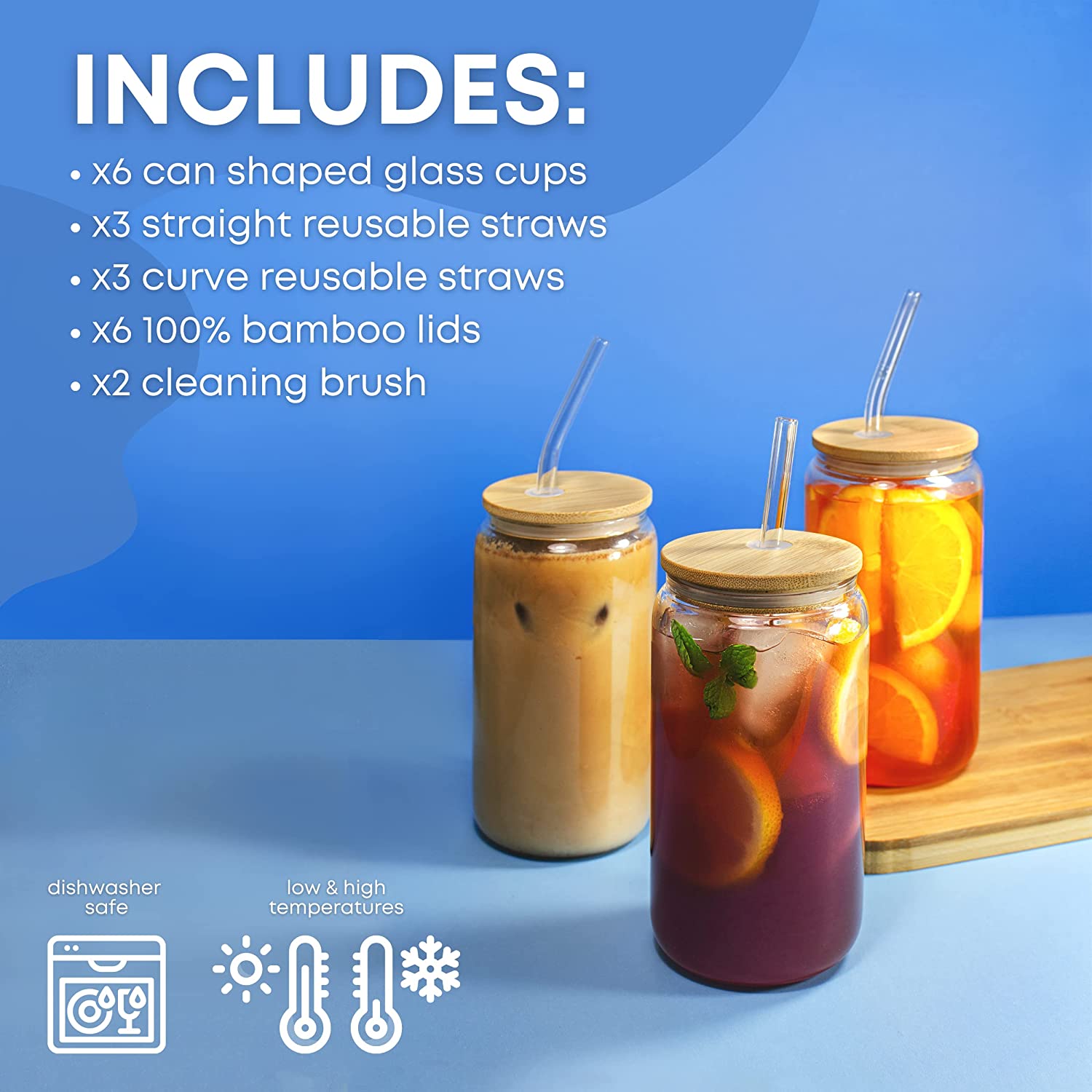 - PRODUCT ASSEMBLY: Drinking Glass Set includes 6 drinking glasses, 6 nature bamboo lids, 3 straight 3 curved reusable straws - 2 cleaning brushes - Lid + Glassware are dishwasher and refrigerator safe!