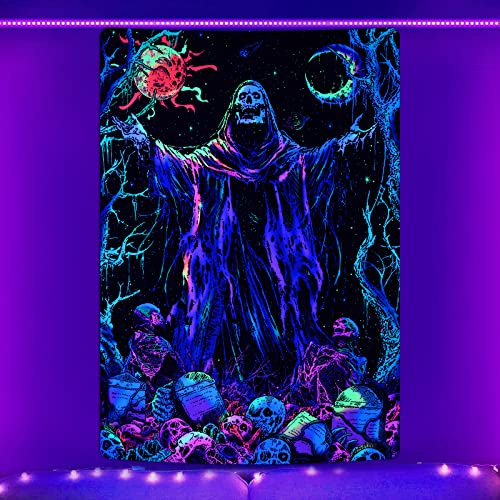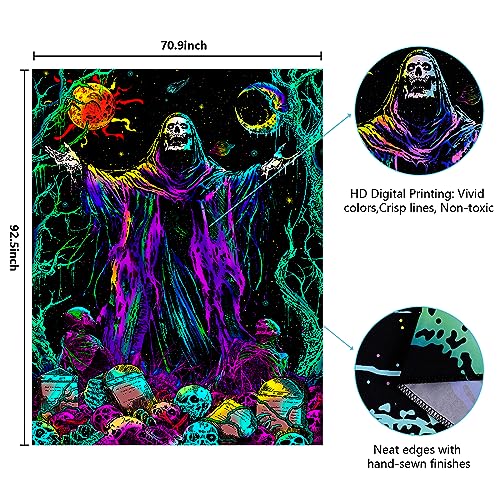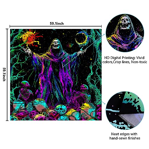 Blacklight Skull Tapestry UV Reactive Sun Moon Tapestries Gothic Wizard Skeleton Tapestry Colorful Witchy