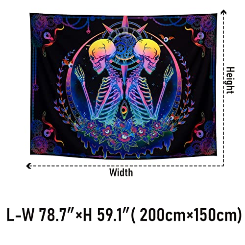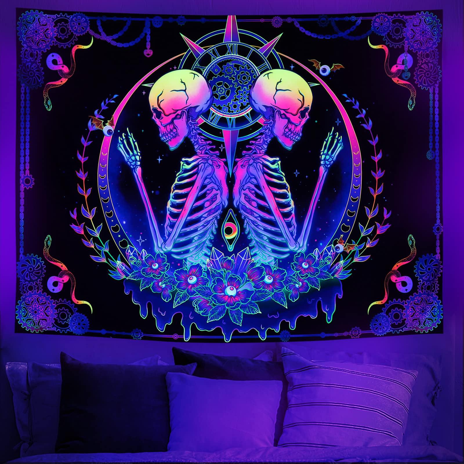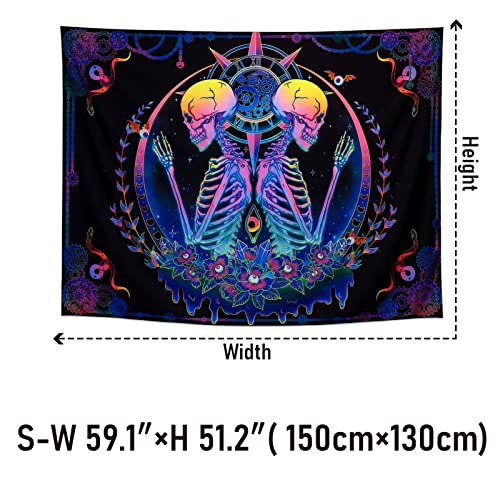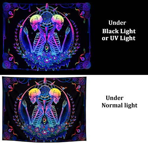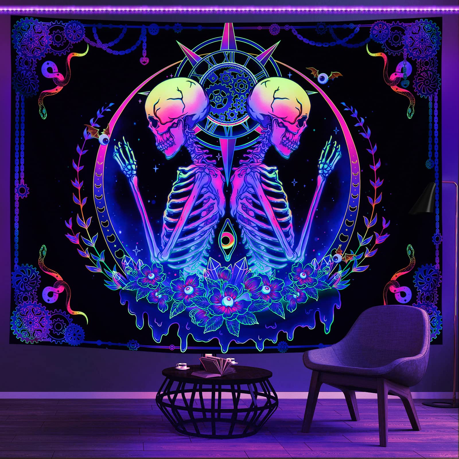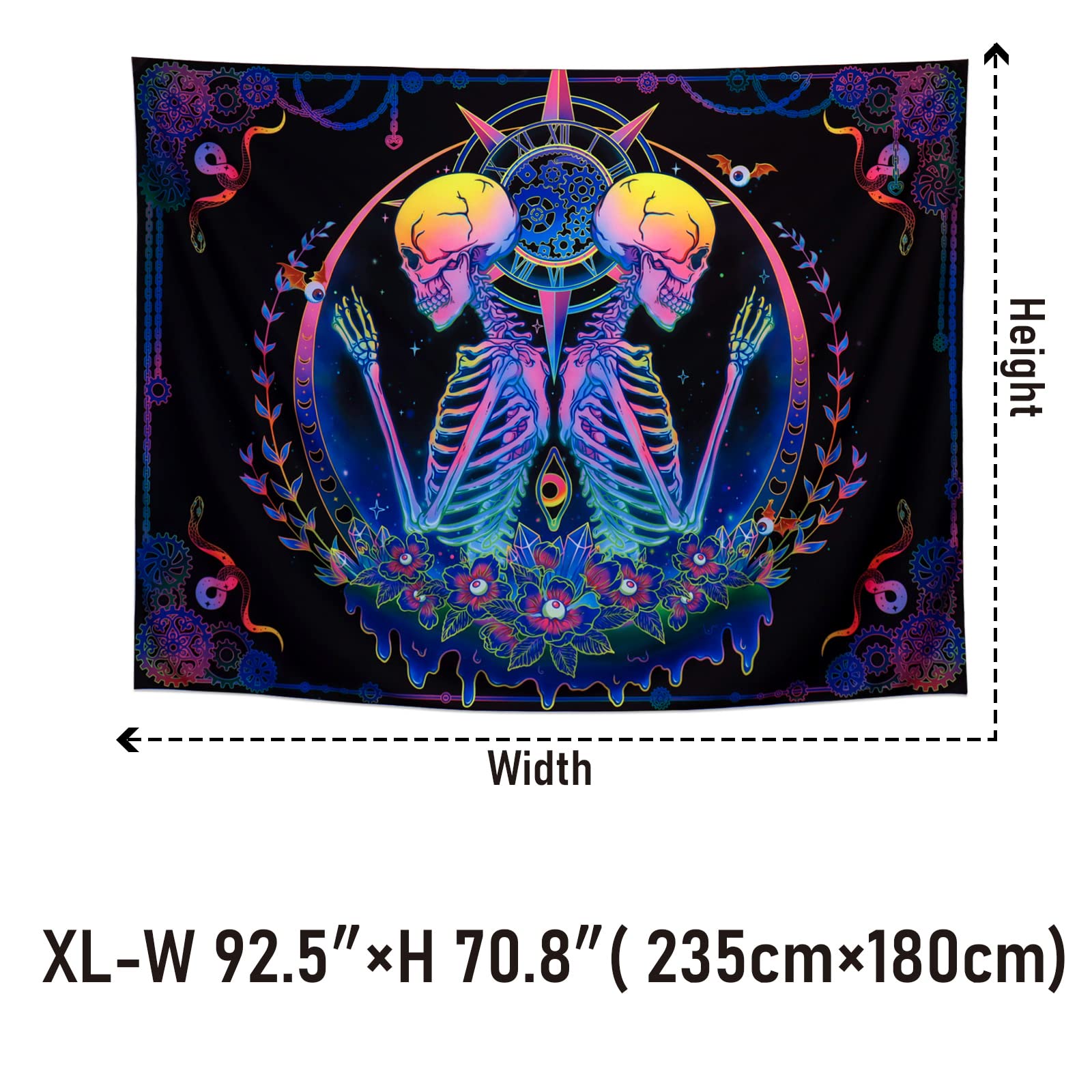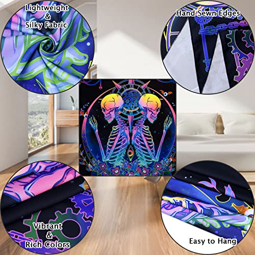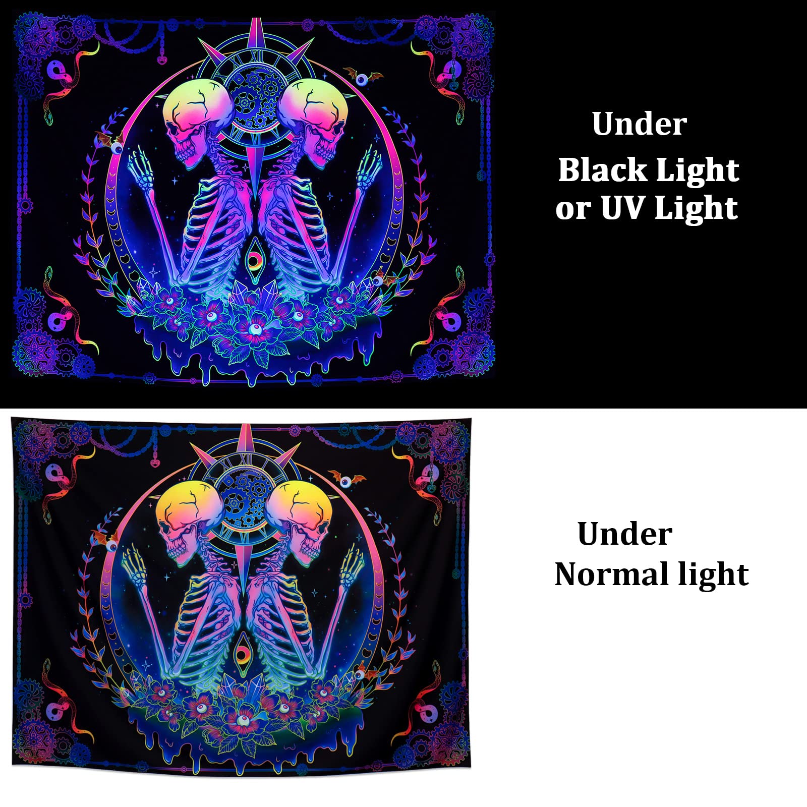 - UV/Black Light Reactive:The UV reactive skull tapestry is composed of a variety of stunning elements, mystical skeletons, dreamy flowers and enchanting starry sky, outlining a mysterious and psychedelic skeleton scene, making your room full of mystery.And it glows gorgeously under black light/UV in the dark. In normal light, the colors are full and vivid.