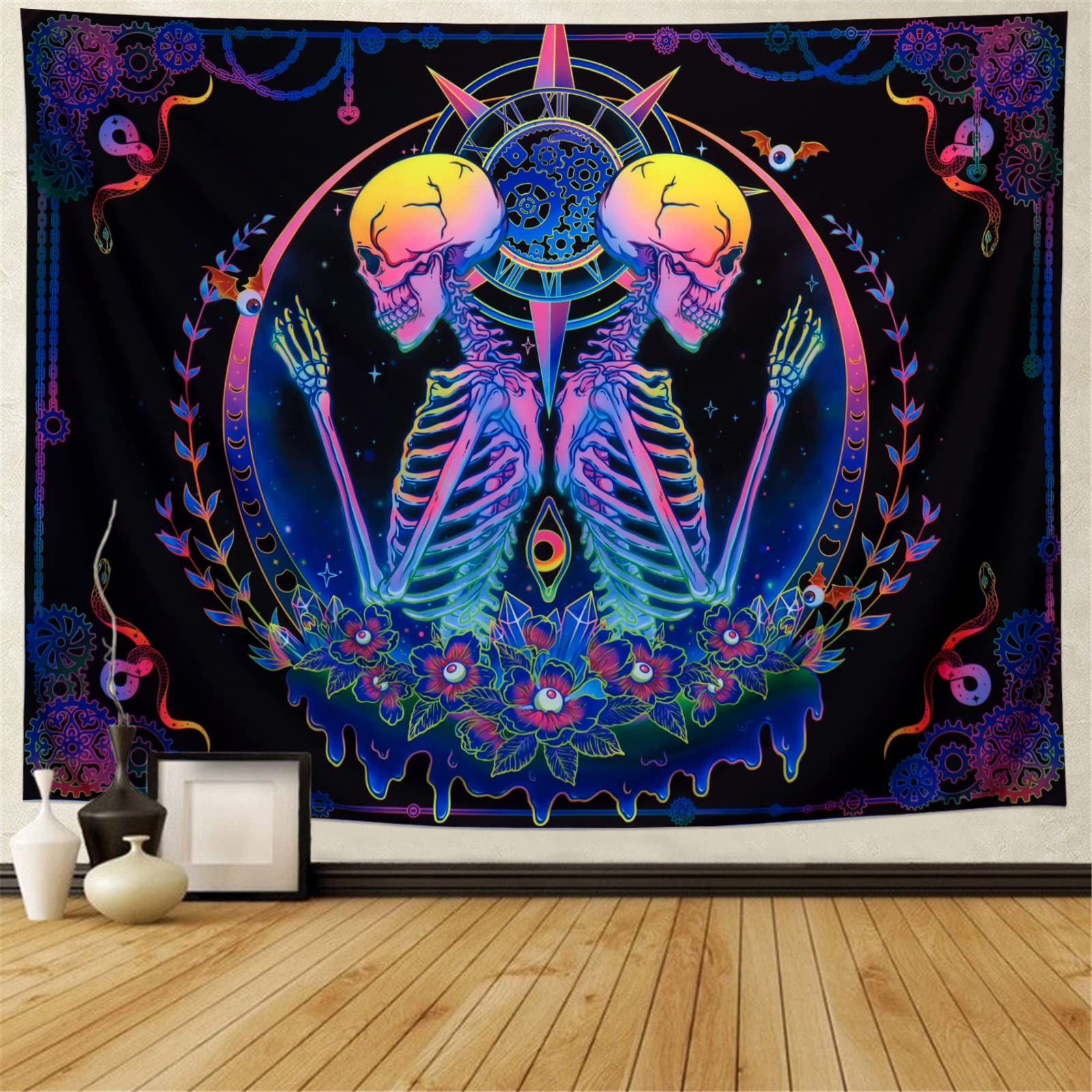 Blacklight Tapestry UV Reactive Skelton Wall Psychedelic Celestial Colorful Flower