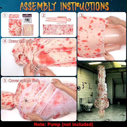 - Easy to assemble - blow up the victim prop with the pump (not included), put it in the bloody bag, and wrap the victim prop with silver tape, cover it with spider web