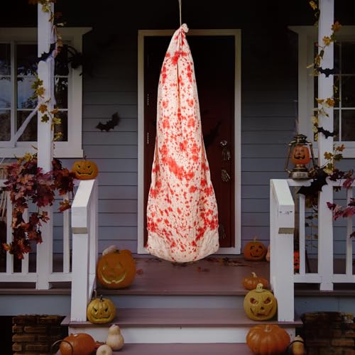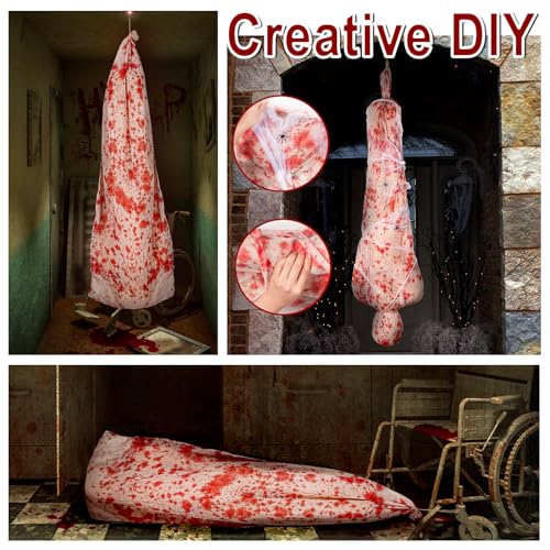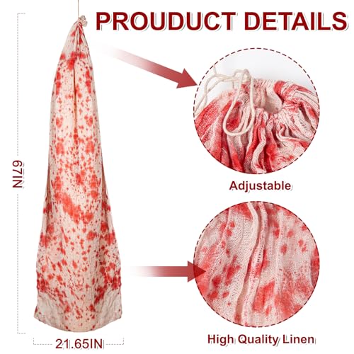 - Material & Sizes - the bloody bag size 67" x 21.6", cheesecloth, durable and real creepy; inflateble body prop size 60", PE plastic; the bloody rope size 13.1ft.